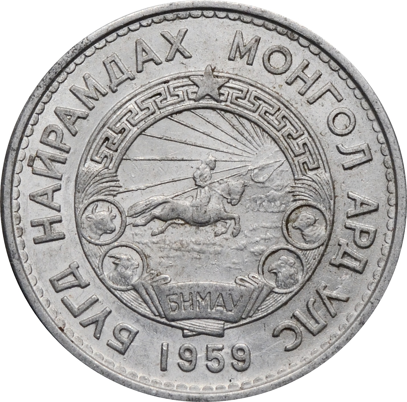 Аверс: по центру изображен Герб Монголии. Вдоль канта надпись: "БУГД НАЙРАМДАХ МОНГОЛ АРД УЛС" и год чеканки: "1959".