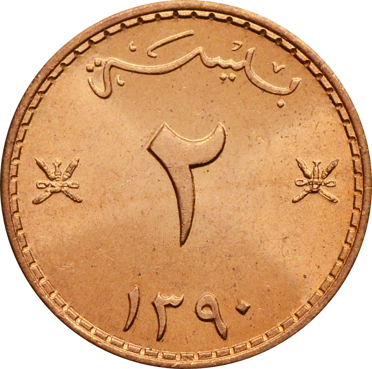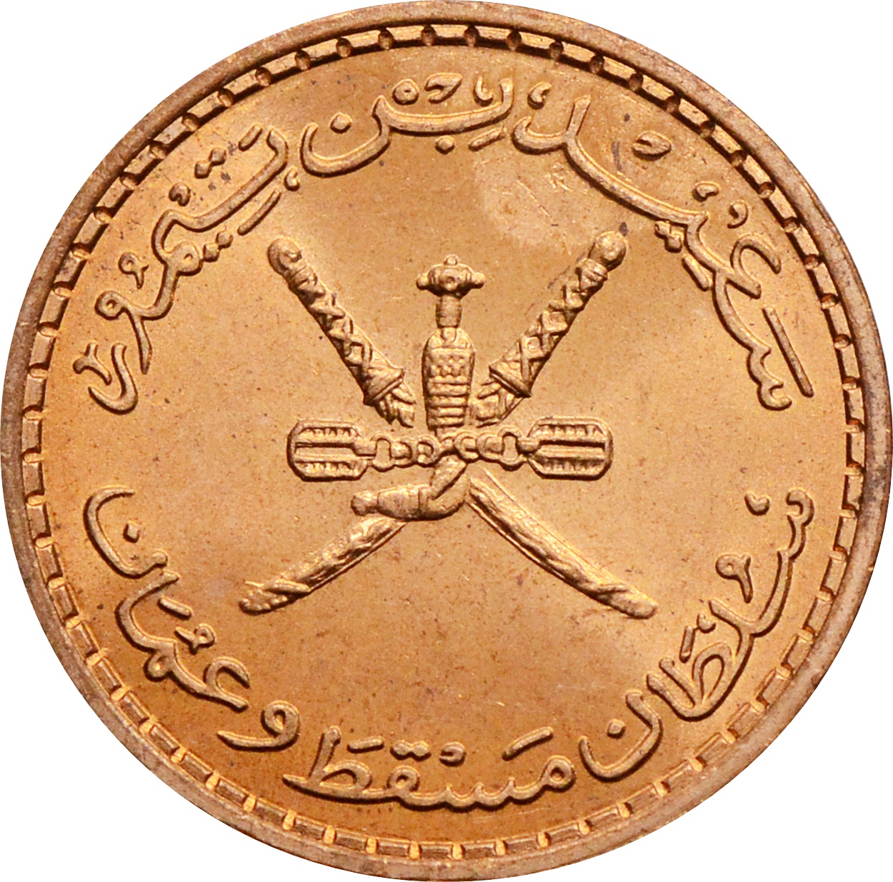 Аверс: в центре монеты изображен герб Омана состоящий из двух скрещённых сабель в ножнах (клинками вниз), и наложенным на них ханджаром в ножнах, с деталями ремней. Вдоль канта надпись: "قابوس بن سعيد/ سلطان عمان".