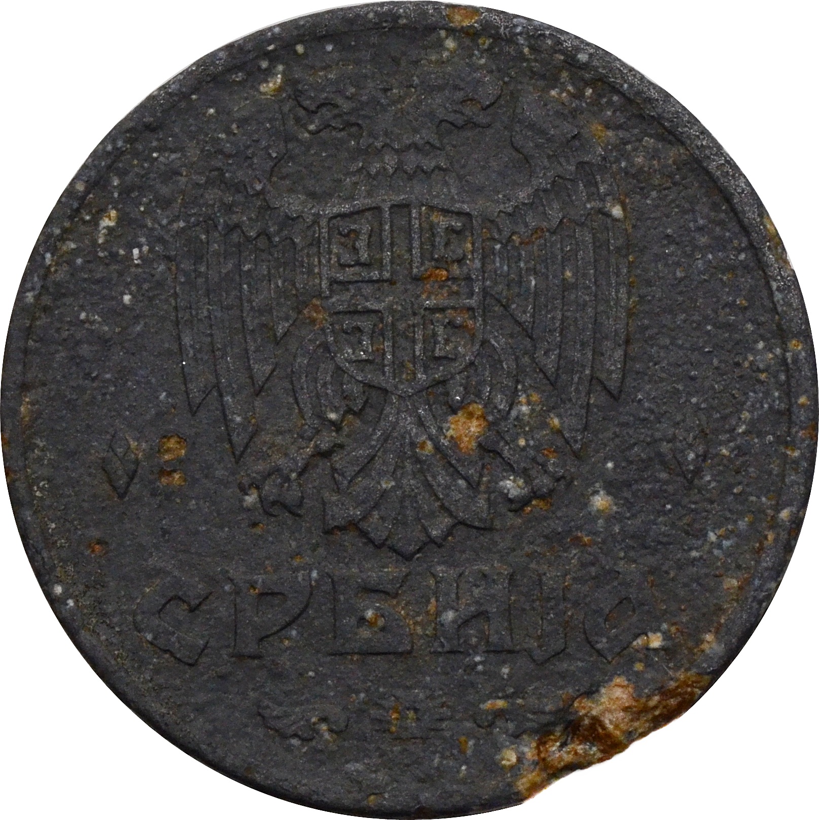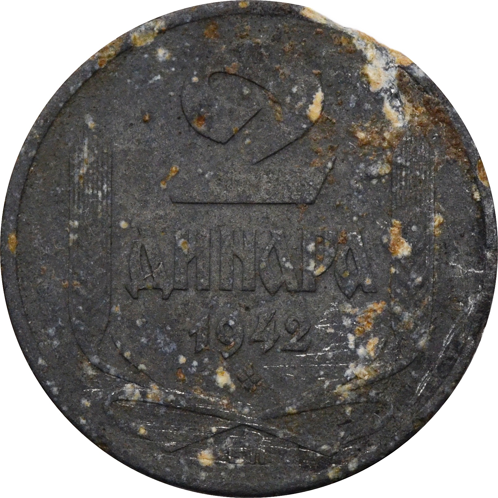 Реверс: по центру номинал: "2 ДИНАРА", под номиналом год чеканки: "1942".