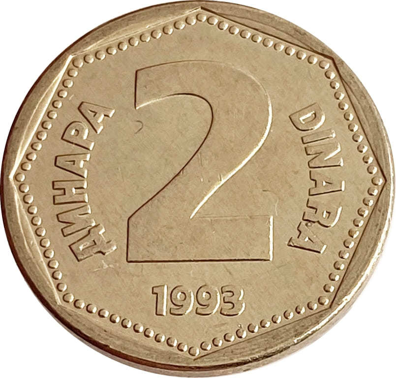 Реверс: в центре указан номинал: "DINARA 2 ДИНАРА". Снизу указан год чеканки: "1993".