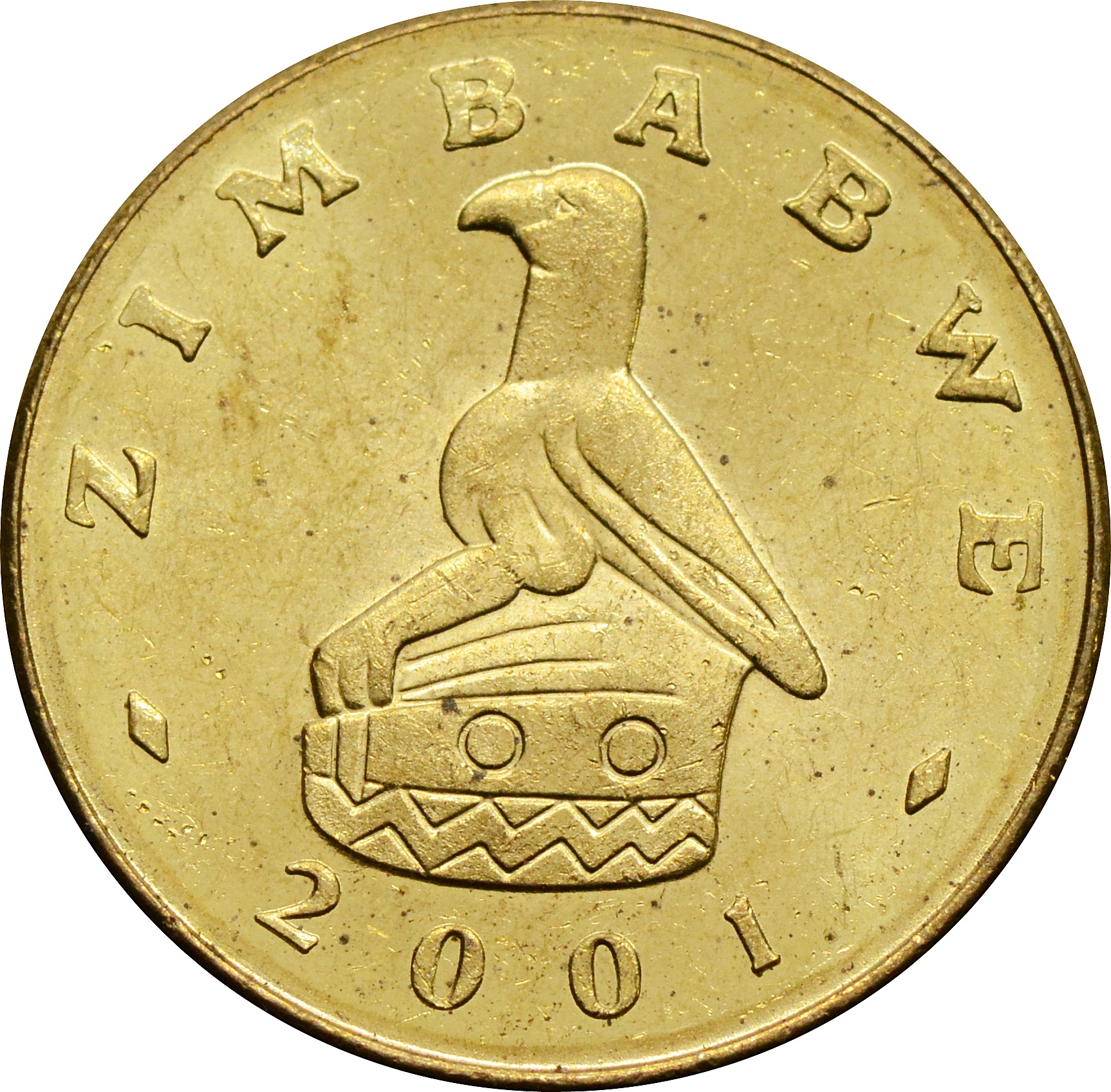 Аверс: в центре монеты изображена национальная эмблема - Птица Зимбабве. Вверху полукругом надпись: "ZIMBABWE", а внизу расположен год чеканки: "2001".
