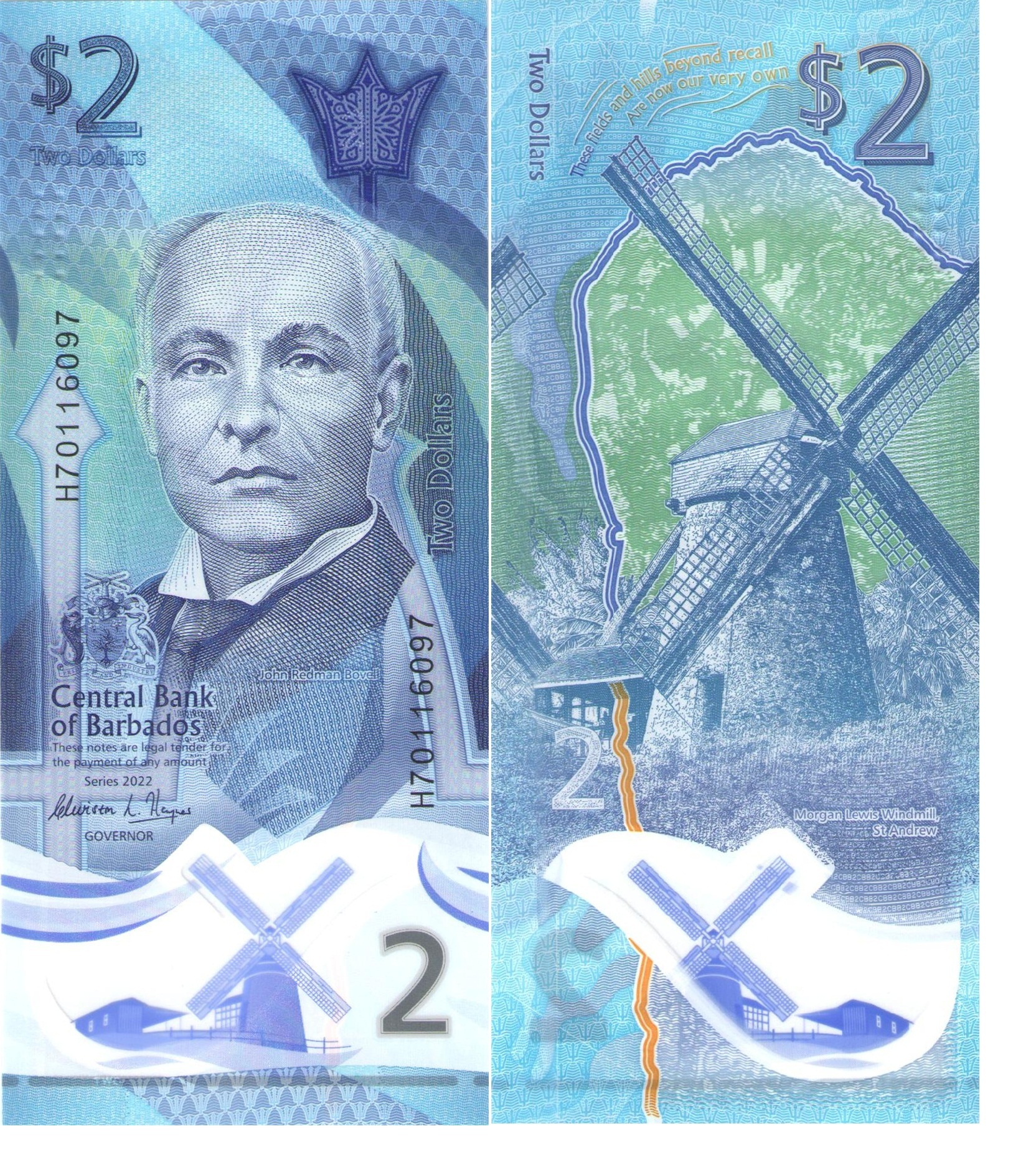 Лицевая сторона: в центре изображен портрет Джона Редмана Бовелла. Сверху надпись: "CENTRAL BANK OF BARBADOS THESE NOTES ARE LEGAL TENDER FOR THE PAYMENT OF ANY AMOUNT", еще ниже дата образца боны: "Series 2022". Правее номинал прописью: "TWO DOLLARS $2". В двух углах номинал: "2$".