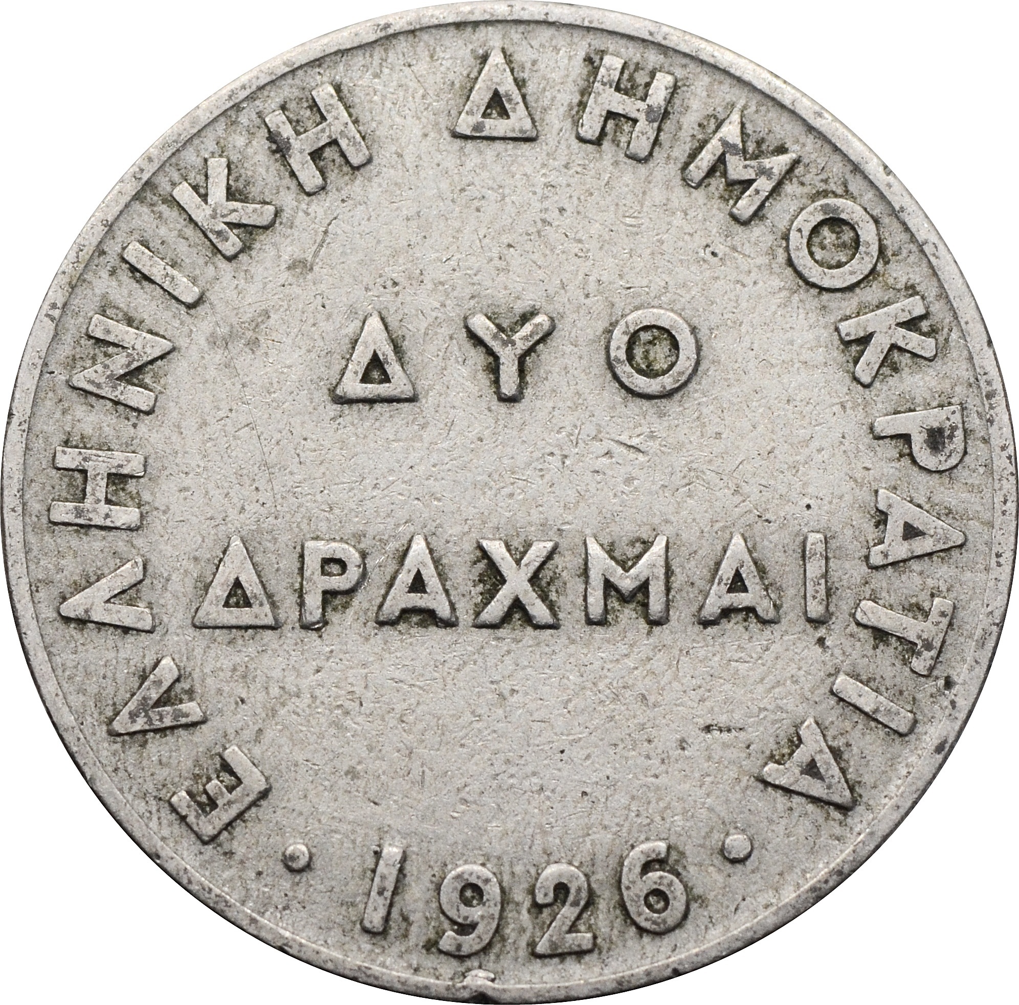 Реверс: в центре указан номинал: "ΔΥΟ ΔΡΑΧΜΑΙ" и год чеканки монеты: "1926". Сверху надпись на греческом: "ΕΛΛΗΝΙΚΗ ΔΗΜΟΚΡΑΤΙΑ".