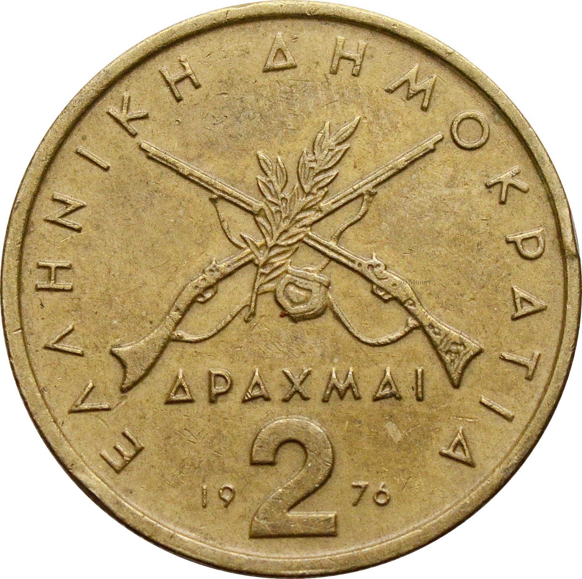 Реверс: в центре изображены два ружья, снизу указан номинал: "2 ΔΡΑΧΜΑΙ" и год чеканки монеты: "1976". Сверху надпись на греческом: "ΕΛΛΗΝΙΚΗ ΔΗΜΟΚΡΑΤΙΑ" (Греческая Республика).