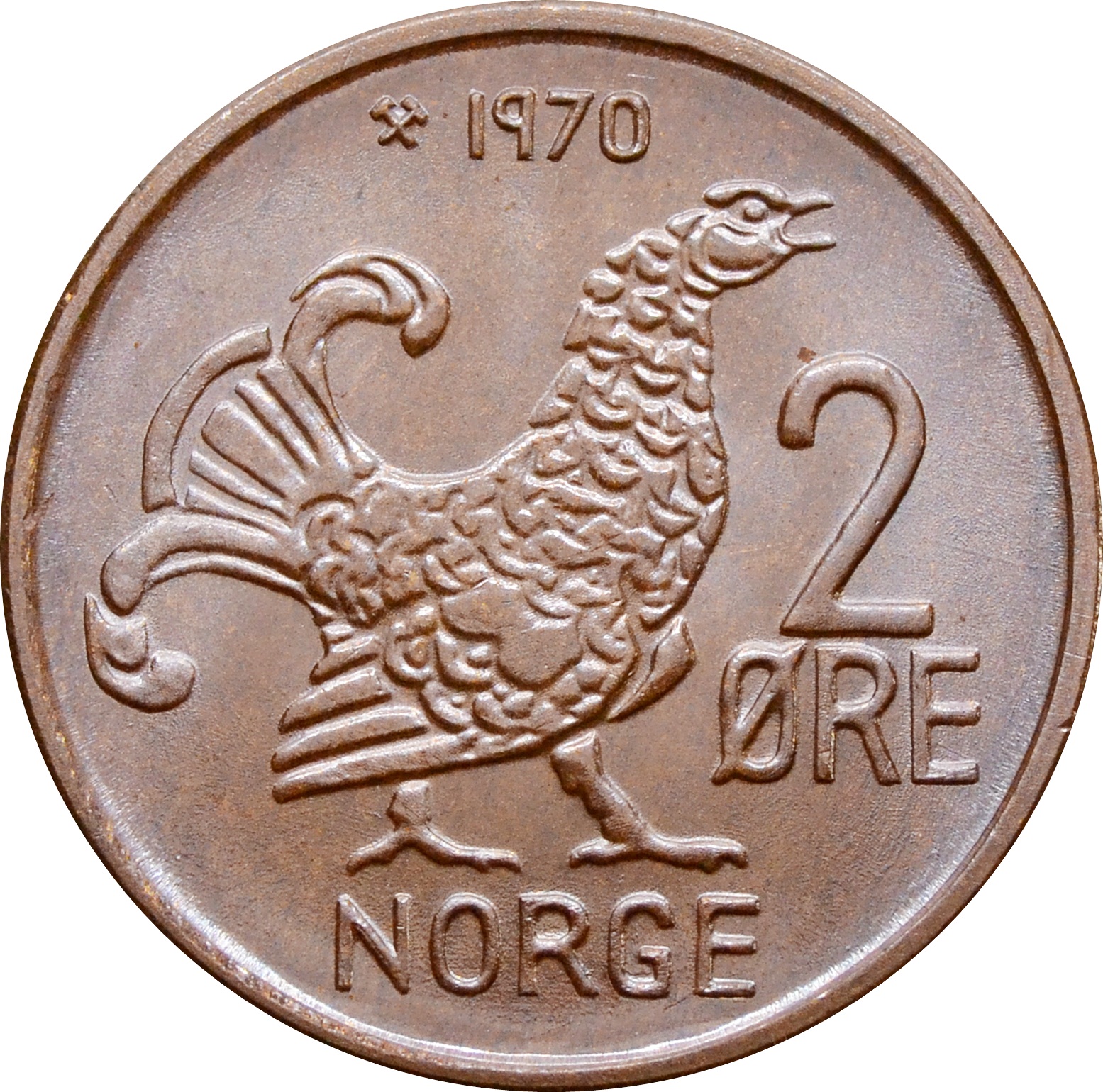 Реверс: по центру изображение птицы (Глухаря), правее от нее указан номинал в две строки: "2 ØRE", а снизу название страны "NORGE". Год чеканки указан сверху: "1970".