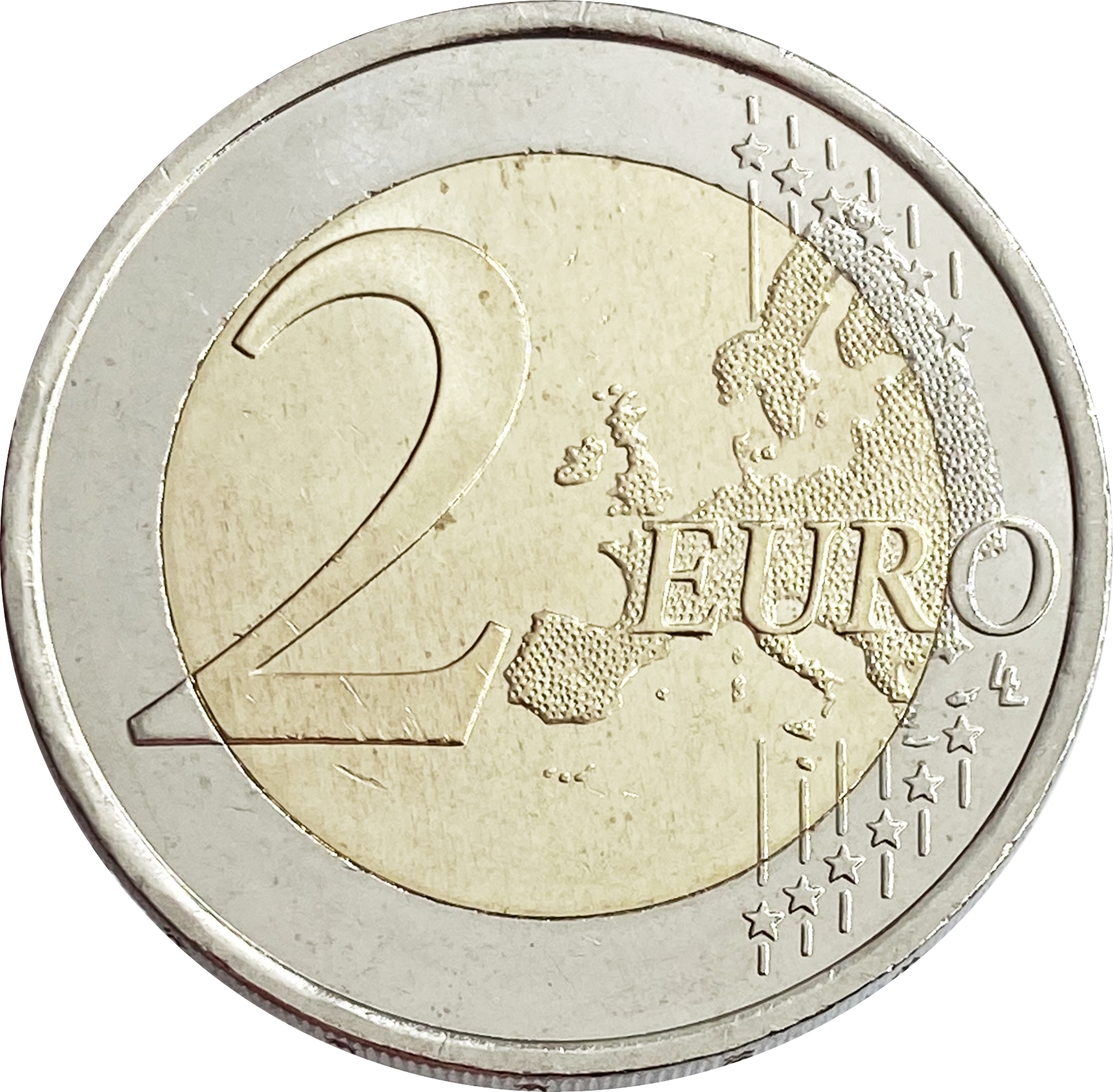 Реверс: в центре указан номинал монеты: "2 EURO", на фоне карты европы.