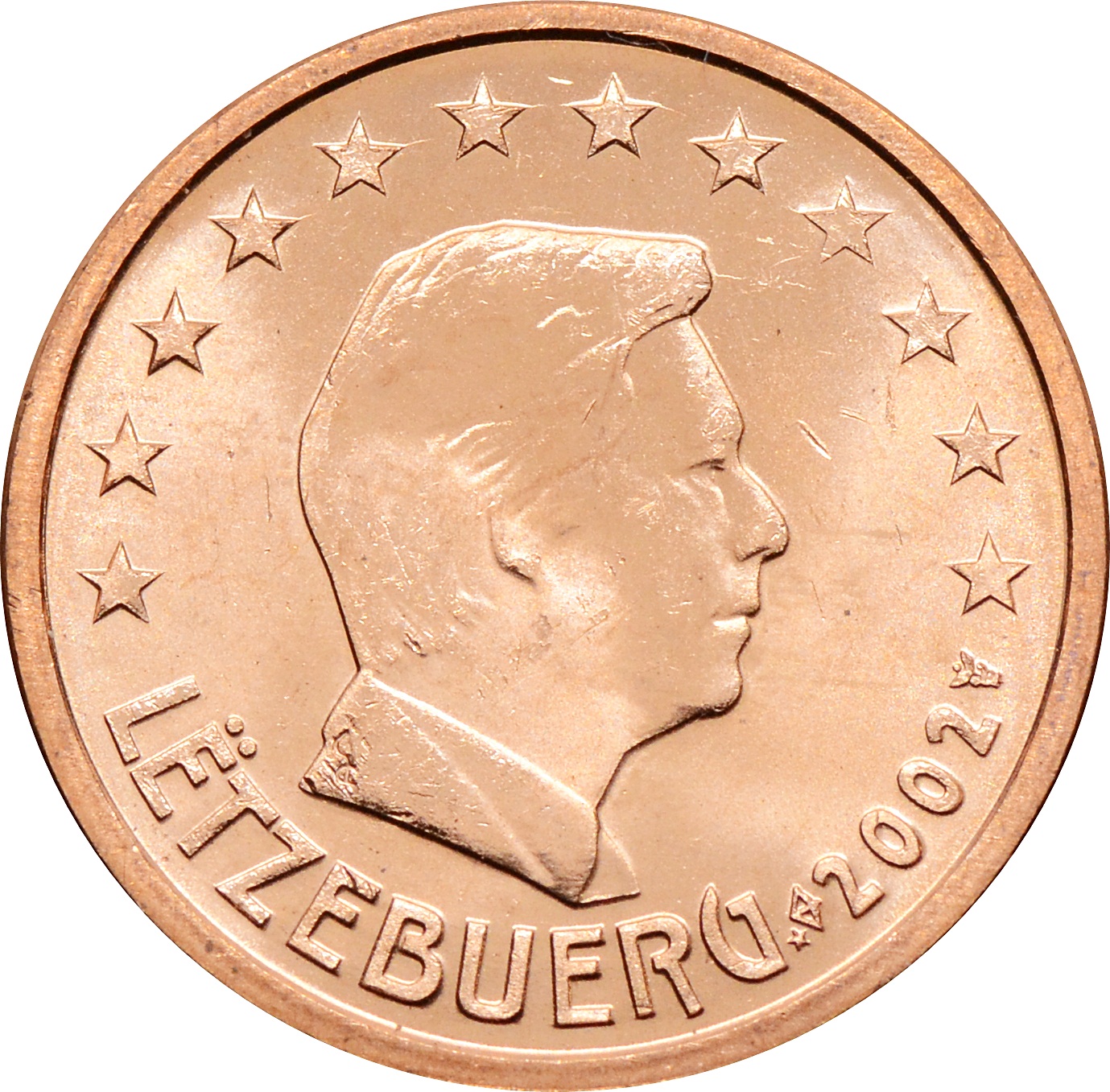 Аверс: по центру изображен портрет великого герцога Люксембурга. Вдоль канта, сверху, 12 звёзд и надпись: "LËTZEBUERG", а так же год чеканки: "2002".