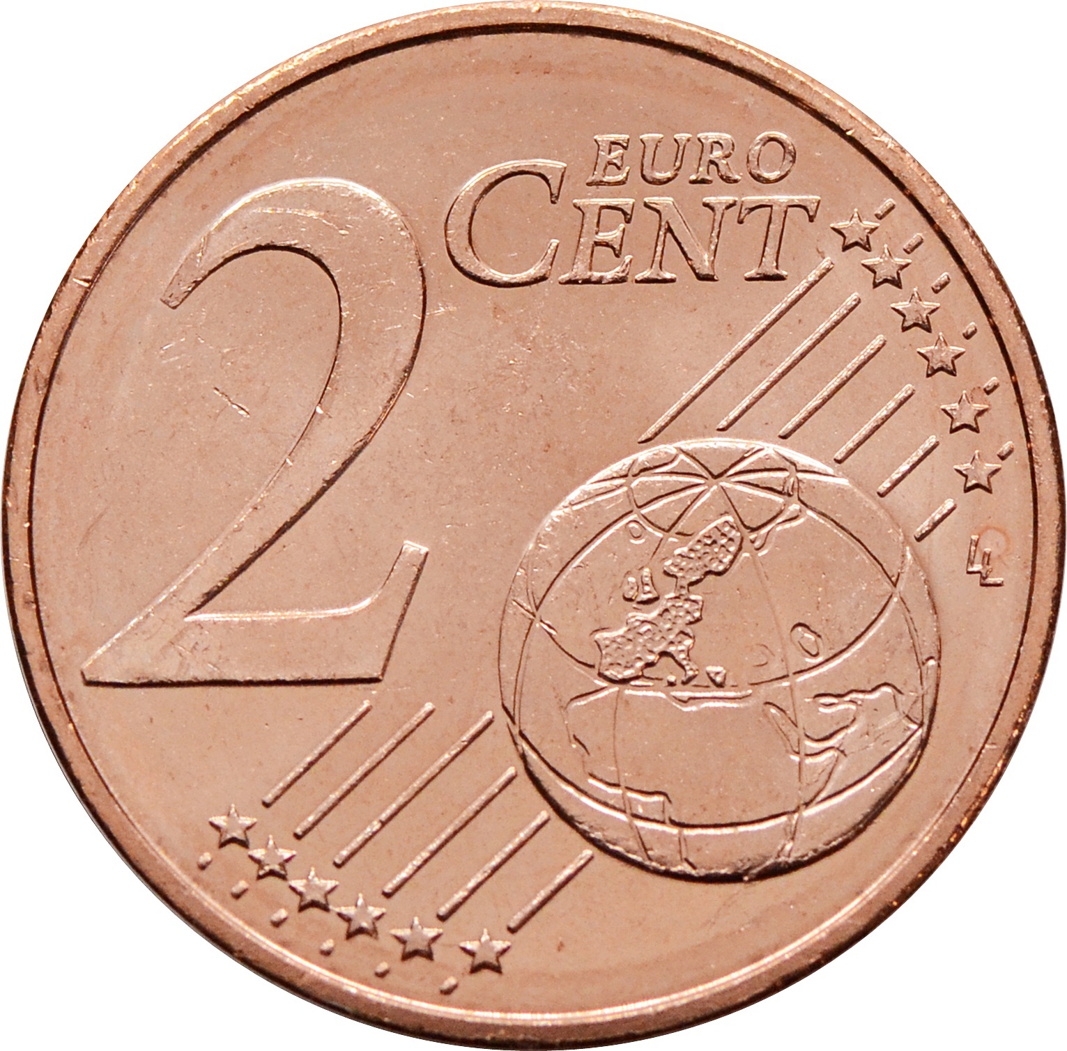 Реверс: в центре указан номинал монеты: "2 EURO CENT". От нижнего левого к верхнему правому краю, по диагонали, проходят шесть линий, на концах которых расположено 12 звёзд. Справа внизу на середине линий изображён земной шар, на переднем плане земного шара представлена европейская часть континента.