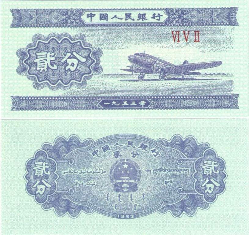 Лицевая сторона: изображение самолета, а так же номинал на китайском.