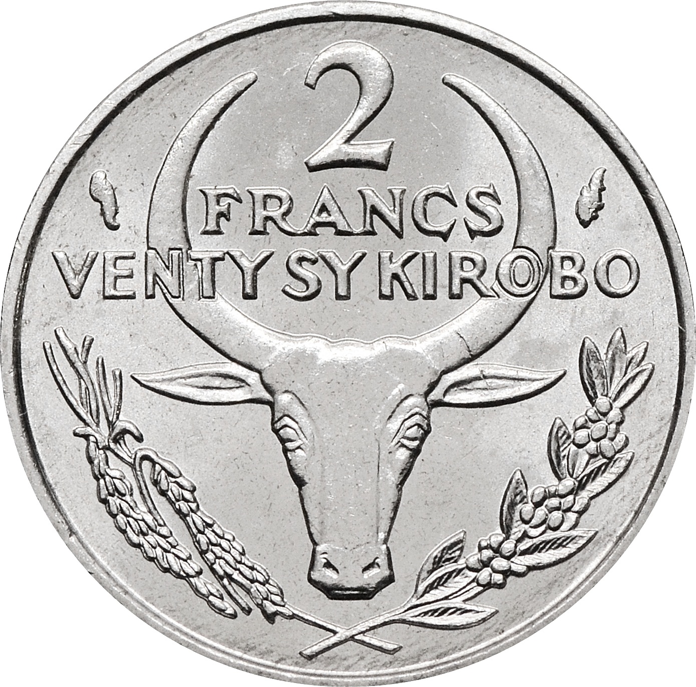Реверс: по центру голова буйвола. Над ней номинал: "2 FRANCS VENTY SY KIROBO".