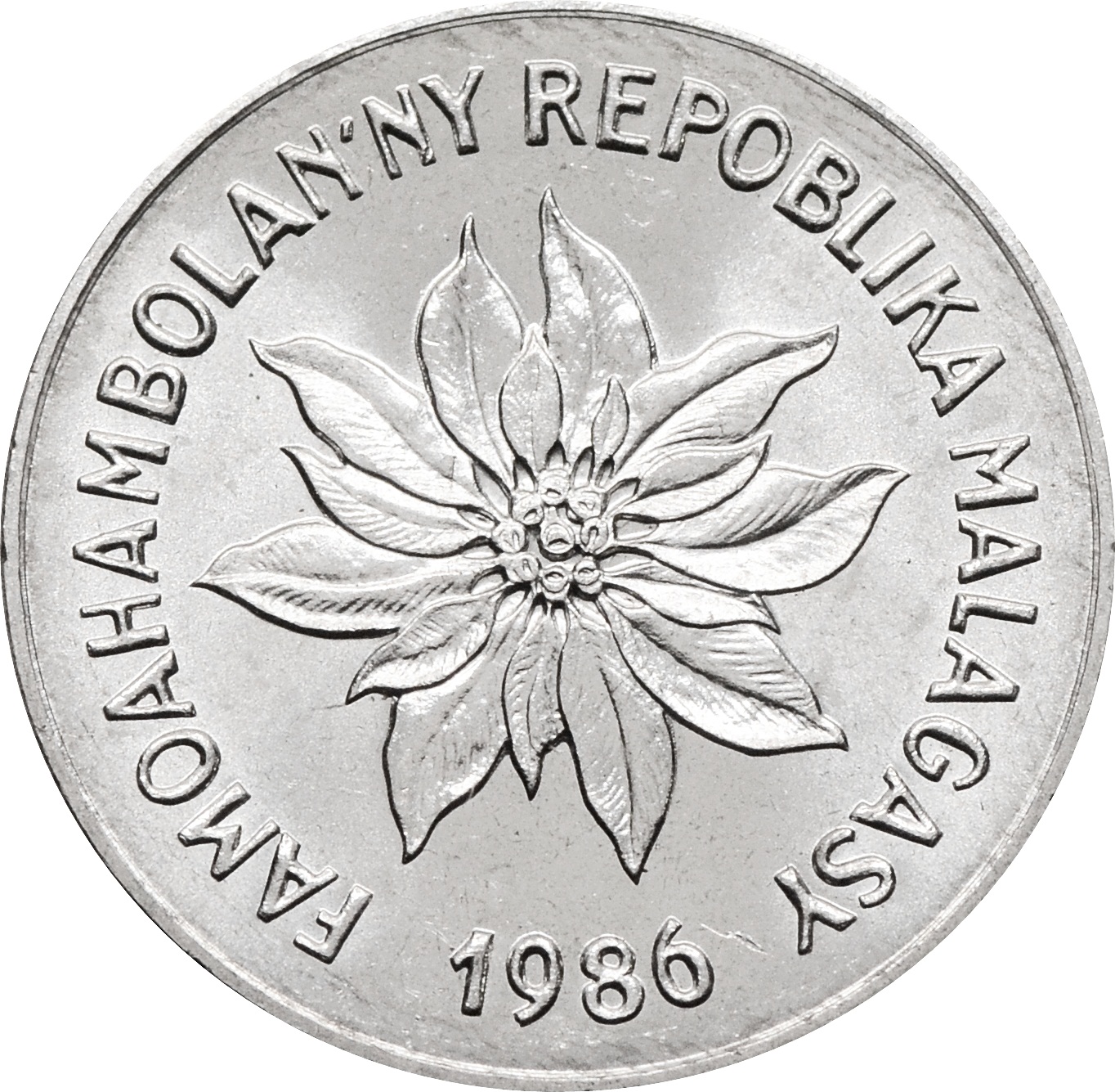 Аверс: в центре монеты изображен цветок - Пуансеттия. Снизу год чеканки: "1986". Вдоль канта надпись: "FAMOAHAMBOLAN'NY REPOBLIKA MALAGASY".