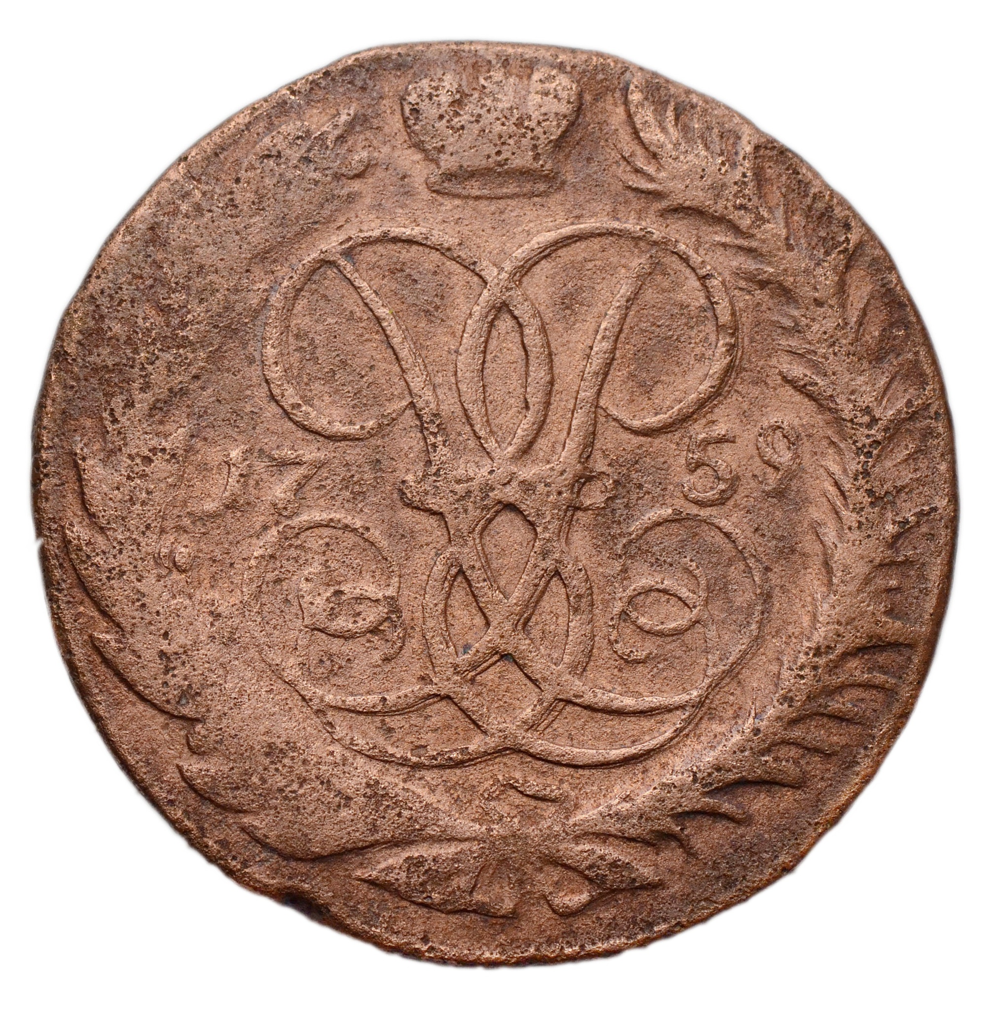 Реверс: по центру изображён вензель императрицы Елизаветы I (Петровны)., разделяющий год чеканки пополам: "1759".