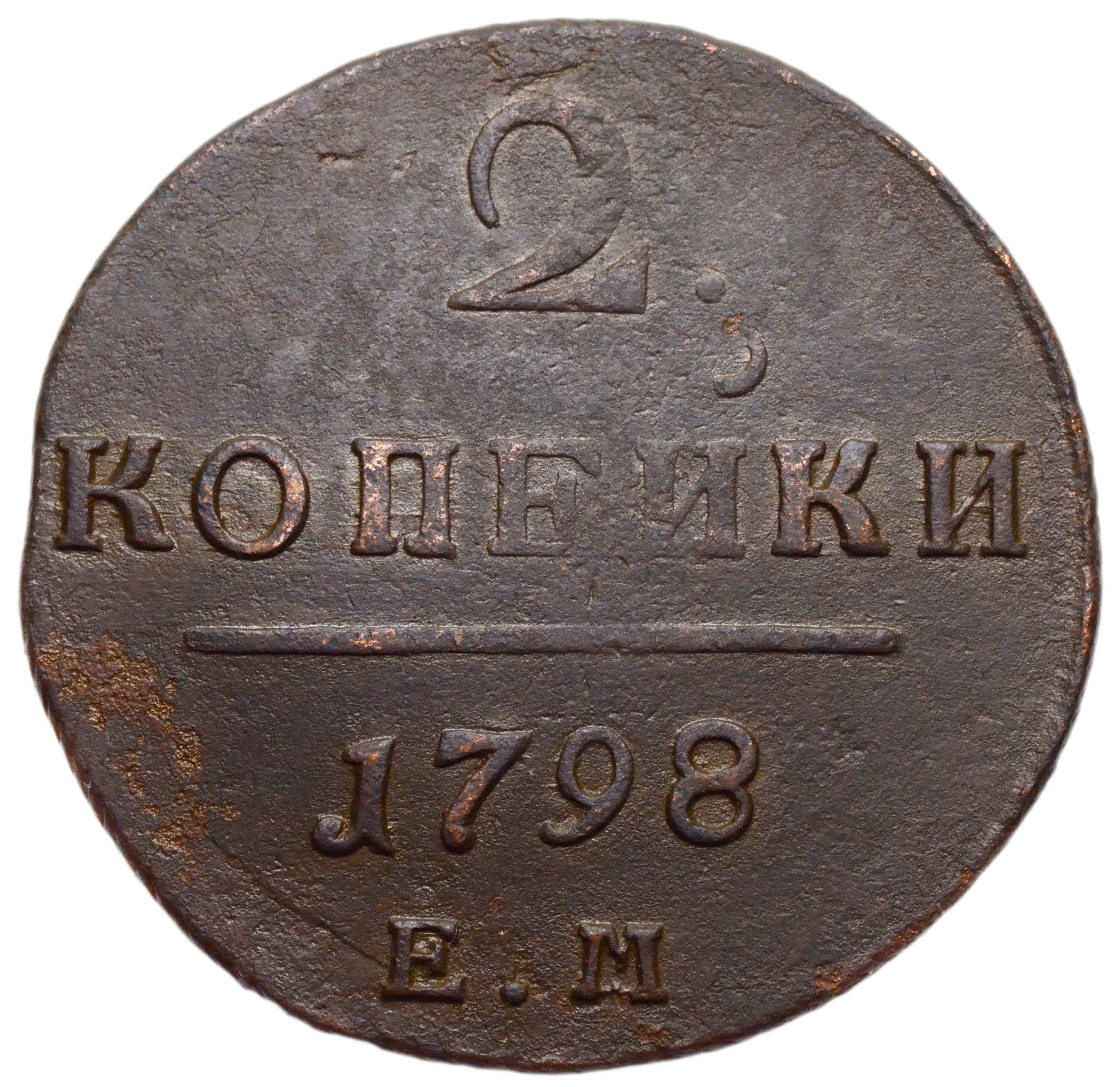 Реверс: по центру сверху номинал: "2 КОПЕЙКИ". Под надписью — прямая черта, под ней — дата чеканки монеты: "1798". Под датой обозначение Екатеринбургского монетного двора — буквы "Е.М".