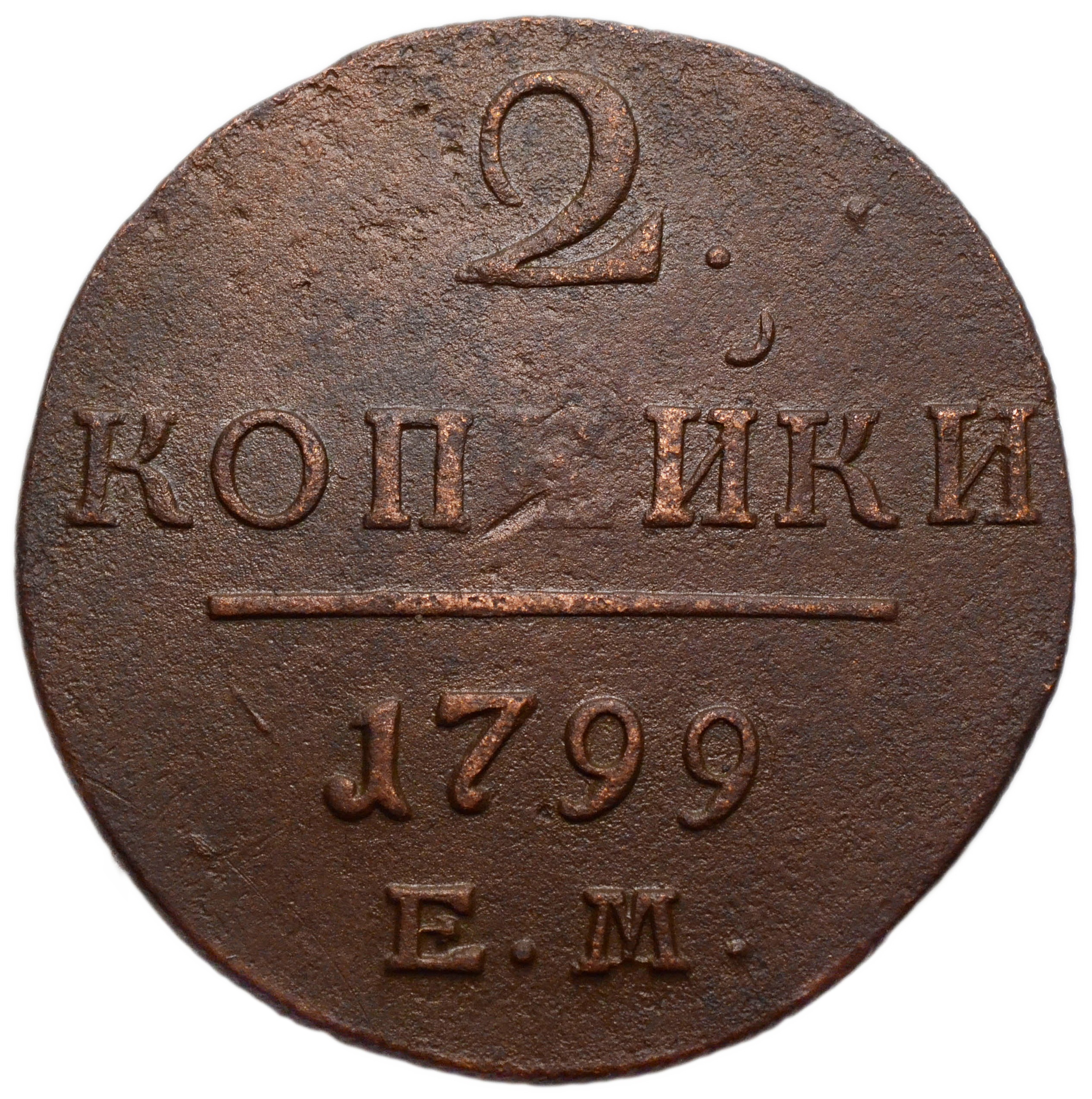Реверс: по центру сверху номинал: "2 КОПЕЙКИ". Под надписью — прямая черта, под ней — дата чеканки монеты: "1799". Под датой обозначение Екатеринбургского монетного двора — буквы "Е.М".