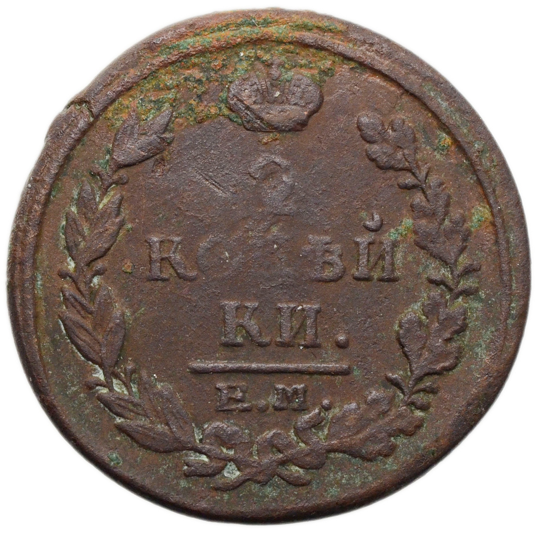 Реверс: в центре указан номинал: "2 КОПЪЙ-КИ". Под надписью обозначение монетного двора: "Е.М.". Над цифрой расположена императорская корона. Кант украшен венком из лавровой и дубовой ветви, не доходящие до короны, которые в нижней части переплетены лентой.