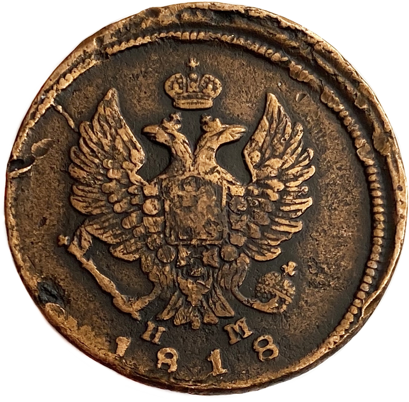 Аверс: по центру изображен Государственный Герб Российской империи - двуглавый орёл с поднятыми вверх распущенными крыльями. На головах которого две короны, а третья, большая над ними. На груди орла расположен Московский герб - щит с изображением Георгия Победоносца, поражающего копьем змея. В правой лапе орла – скипетр, в левой – держава. Под правой лапой – буква «Н», под левой – буква «М». Инициалы минцмейстера. Под инициалами дата чеканки монеты: "1818".