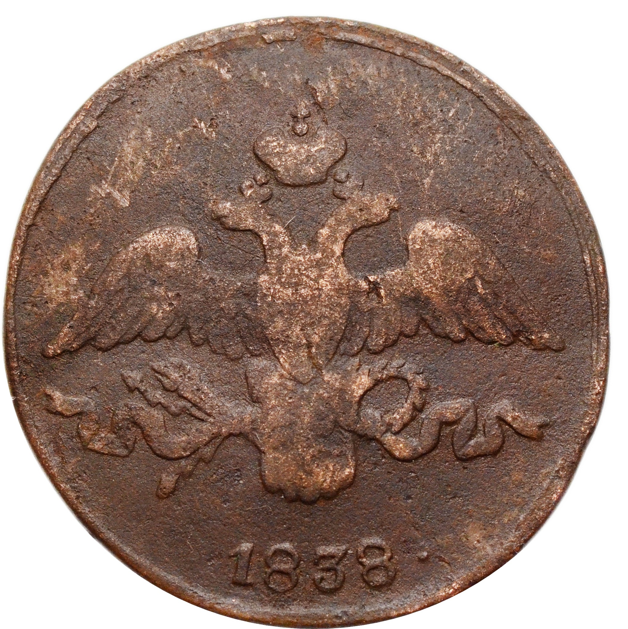 Аверс: в центре изображен Государственный Герб Российской империи - двуглавый орёл с распростёртыми и опущенными вниз крыльями. Над головами орла - императорская корона. На груди орла расположен Московский герб - щит с изображением Георгия Победоносца, поражающего копьем дракона. Орёл держит, перевитые орденской лентой ордена Св. Апостола Андрея Первозванного, громовые стрелы и факел в правой лапе и лавровый венок — в левой. Снизу год чеканки монеты: "1838".