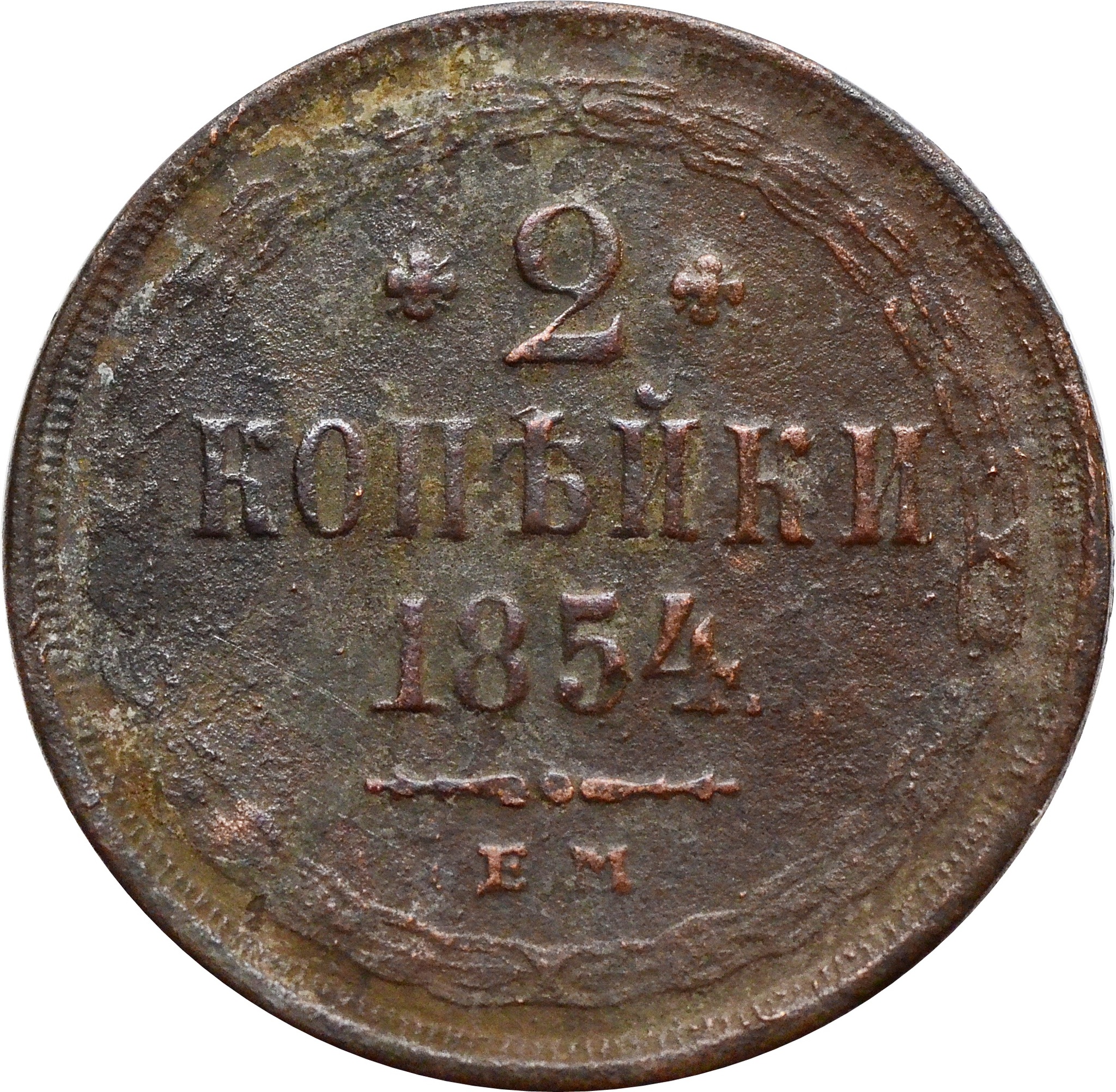 Реверс: по центру указан номинал: "2 КОПЪЙКИ", под ним год чеканки монеты: "1854". Ниже, расположен декоративный разделитель в виде двух фигурных линий и небольшой точки между ними. Под разделителем обозначение монетного двора: "Е.М.".