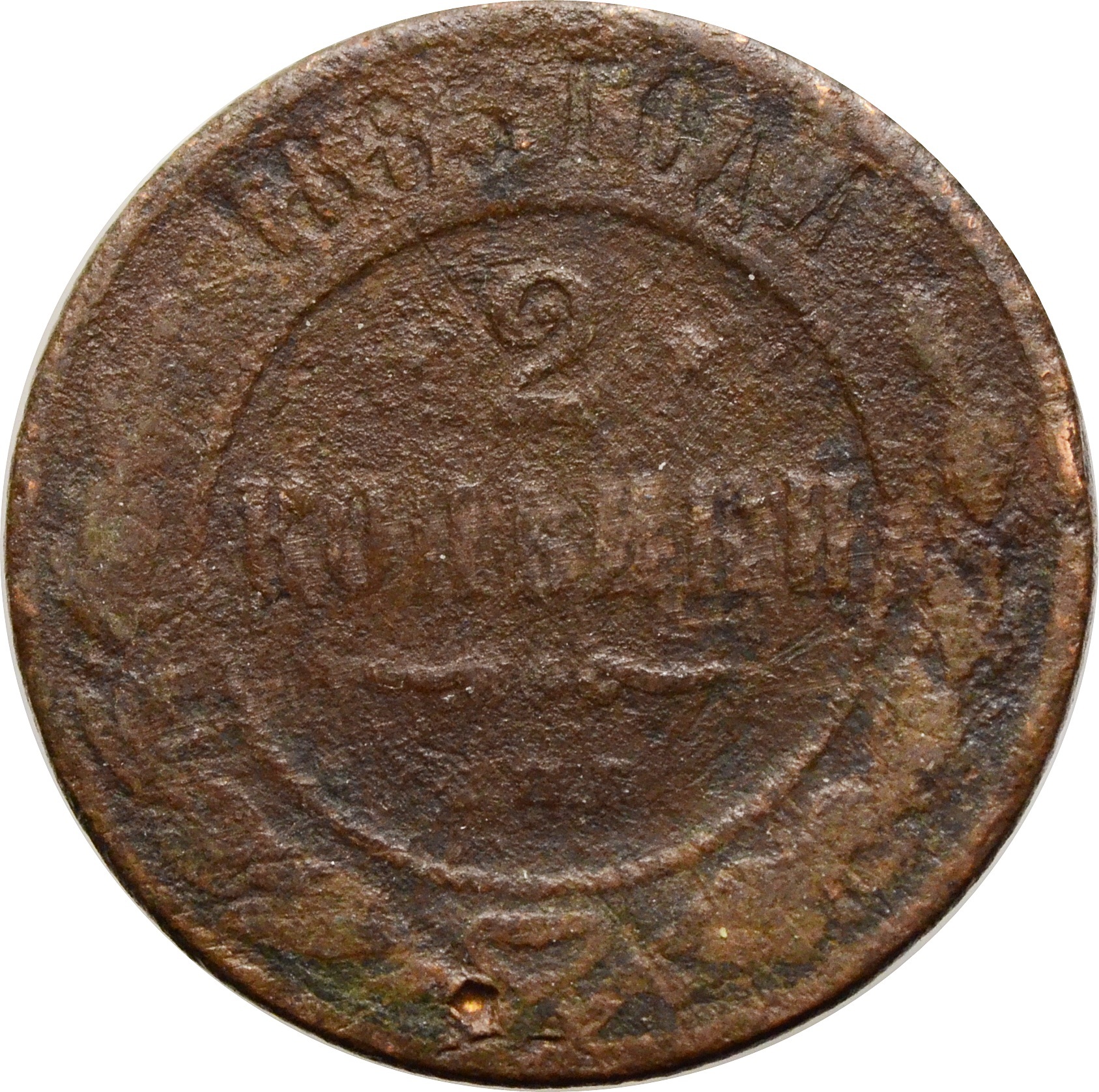Реверс: в центре указан номинал: "2 КОПѢЙКИ". Под номиналом, расположен декоративный разделитель. Под разделителем можно увидеть обозначение монетного двора: "СПБ". Центральная часть отделена от остального изображения, окружностью в виде точек. В верхней части полукругом, вдоль канта, расположен год чеканки: "1885 ГОДА". Ниже этой надписи, вдоль канта, изображен венок из лавровой и дубовой ветвей, которые, в нижней части, перевязаны лентой на узел бантом.