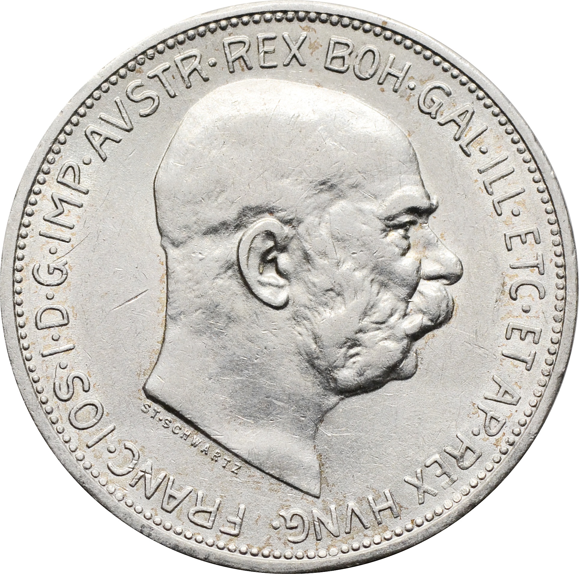 Аверс: по центру размещен портрет правителя Франца Иосифа I вправо. Вдоль канта, по кругу, надпись: "FRANC IOS I D G IMP AVSTR REX BOH GAL ILL ETC ET AP REX HVNG".