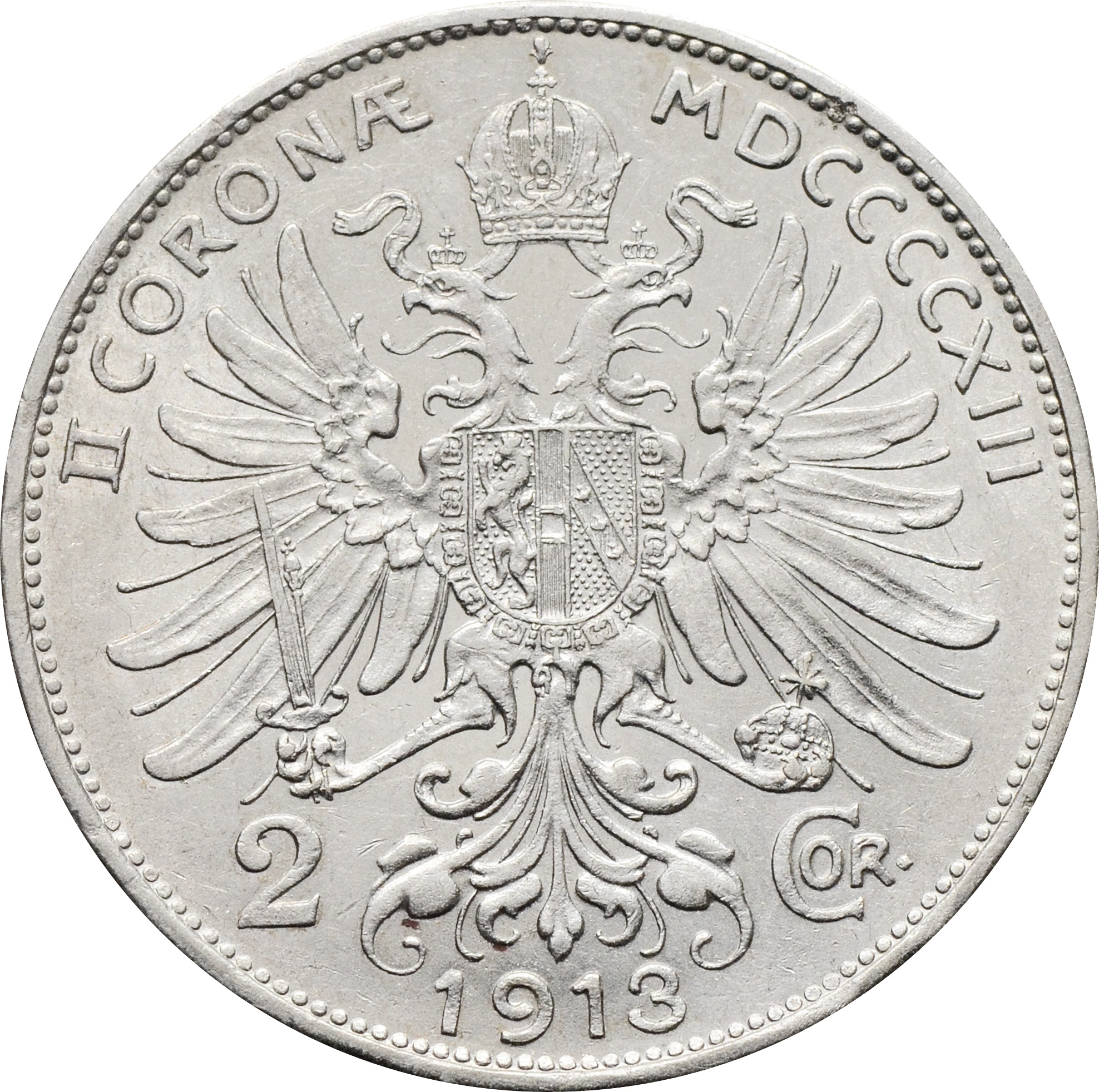 Реверс: в центре монеты изображен герб. Снизу год чеканки: "1913". По обе стороны от герба номинал: "2 COR". Сверху надпись: "II CORONÆ MDCCCCXIII".