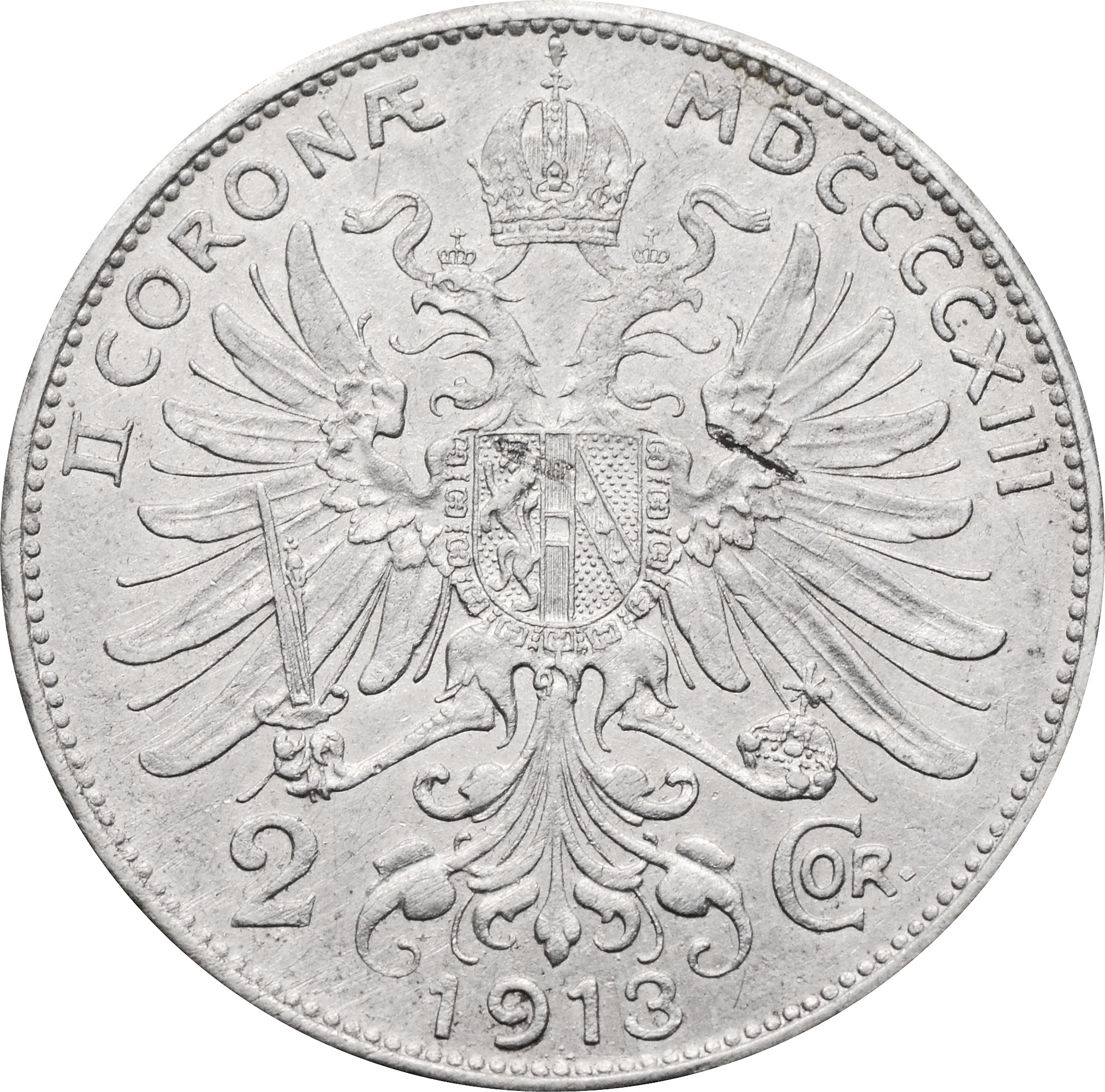 Реверс: в центре монеты изображен герб. Снизу год чеканки: "1913". По обе стороны от герба номинал: "2 COR". верху надпись: "II CORONÆ" MDCCCCXIII".