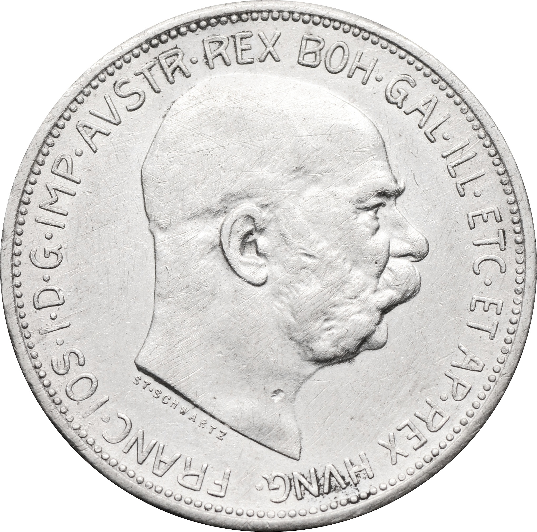 Аверс: по центру размещен портрет правителя Франца Иосифа I вправо. Вдоль канта, по кругу, надпись: "FRANC IOS I D G IMP AVSTR REX BOH GAL ILL ETC ET AP REX HVNG".