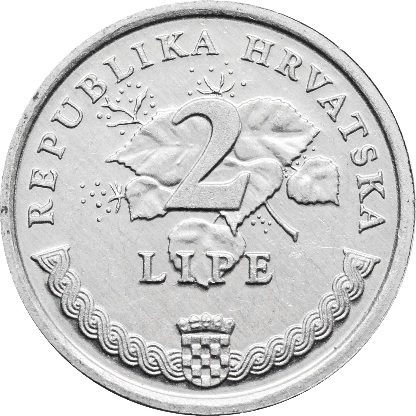 Реверс: по центру монеты указан номинал на фоне листьев липы: "2 LIPE", вверху полукругом надпись: "REPUBLIKA HRVATSKA". Под номиналом расположен маленький герб.