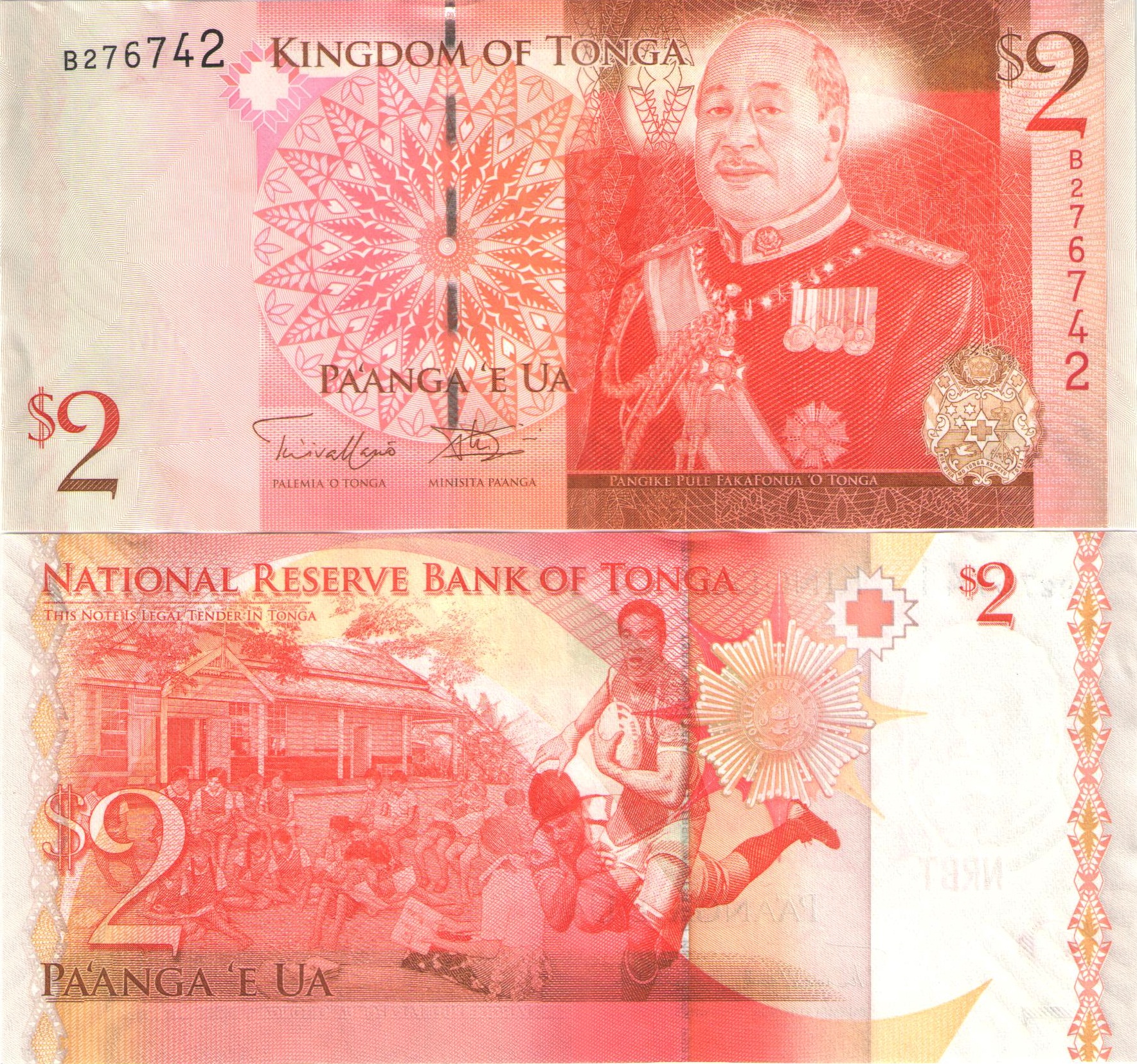 Лицевая сторона: правее портрет короля Тонги Георга Тупоу V. Рядом указан серийный номер банкноты. Сверху, по центру, надпись: "Kingdom of Tonga". В правом верхнем и левом нижнем углах расположен номинал: "$2". В самом низу номинал прописью: "Pa'anga 'E Ua". Под портретом короля содержится подпись: "Pangike Pule Fakafonua 'O Tonga".