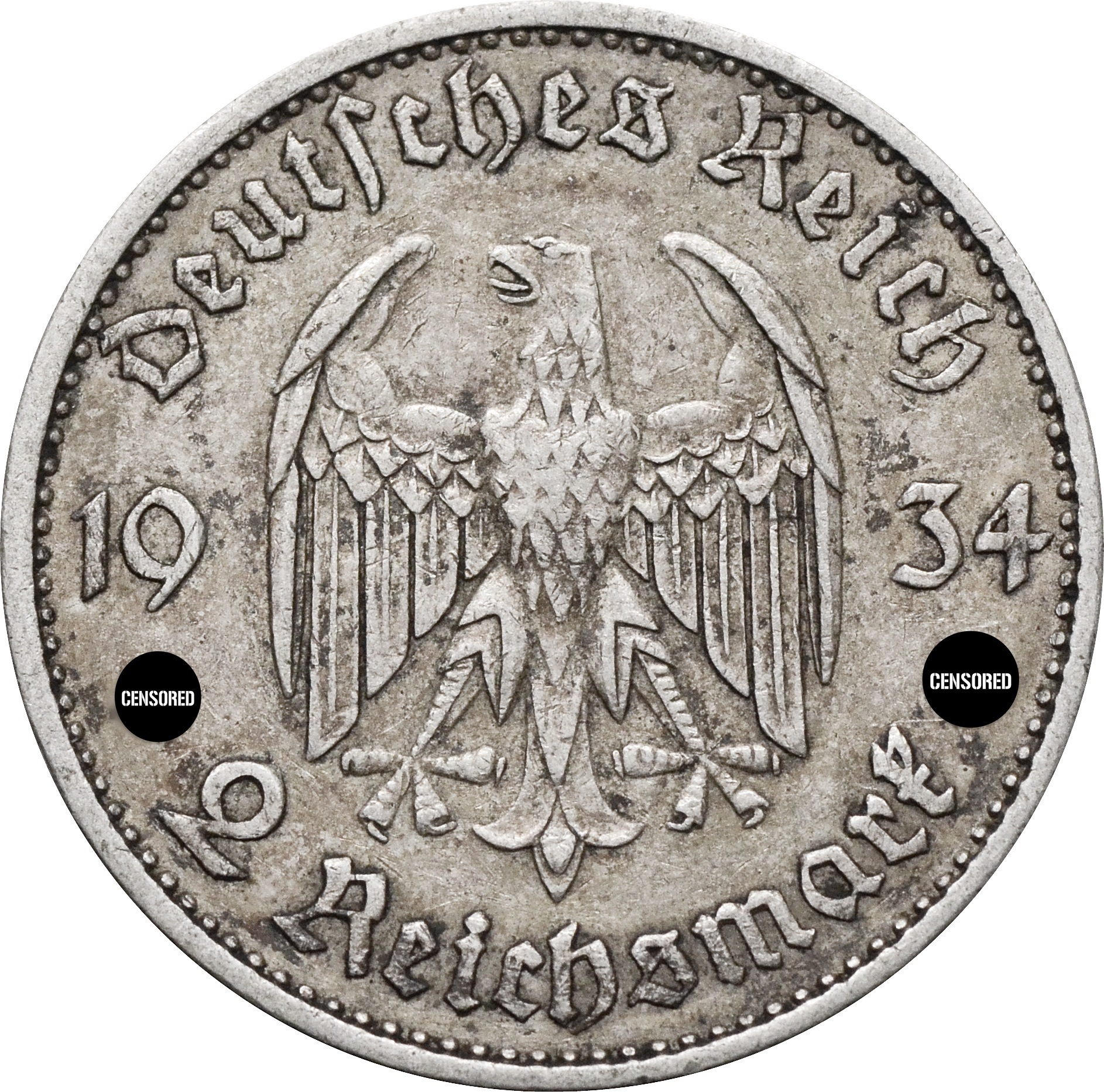 Юбилейная монета, посвященная первой годовщине нацистского режима в Германии. На монете изображена гарнизонная церковь в Потсдаме, а также указана дата - 21 марта 1933 года. Монета имеет нумизматическое "прозвище" - подписная кирха, является более редкой и ценится выше, чем монеты без указания даты.