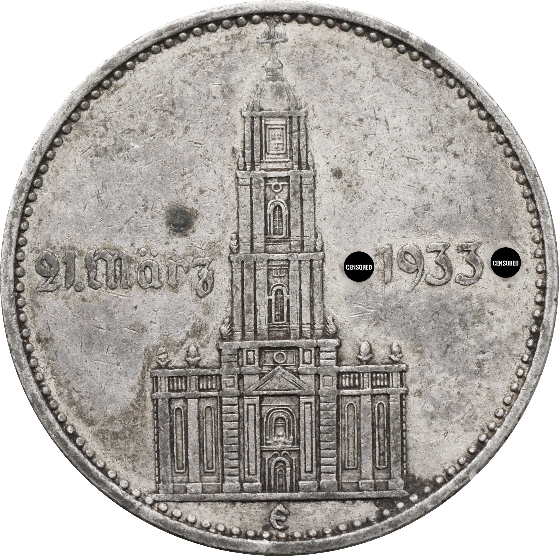 Юбилейная монета, посвященная первой годовщине нацистского режима в Германии. На монете изображена гарнизонная церковь в Потсдаме, а также указана дата - 21 марта 1933 года. Монета имеет нумизматическое "прозвище" - подписная кирха, является более редкой и ценится выше, чем монеты без указания даты.