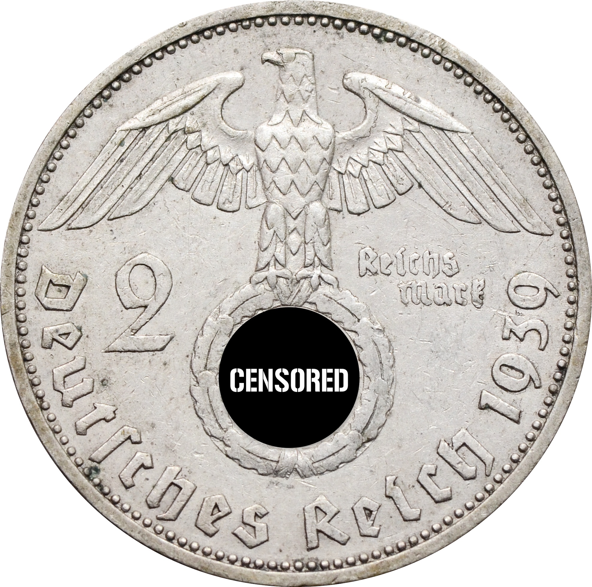 Аверс: по центру монеты изображен обращённый вправо геральдический орёл. Он держит в лапах венок со свастикой. Снизу полукругом надпись: "Deutsches Reich" и год чеканки: "1939". Венок со свастикой разделяет номинал: "2 Reichs Mark"