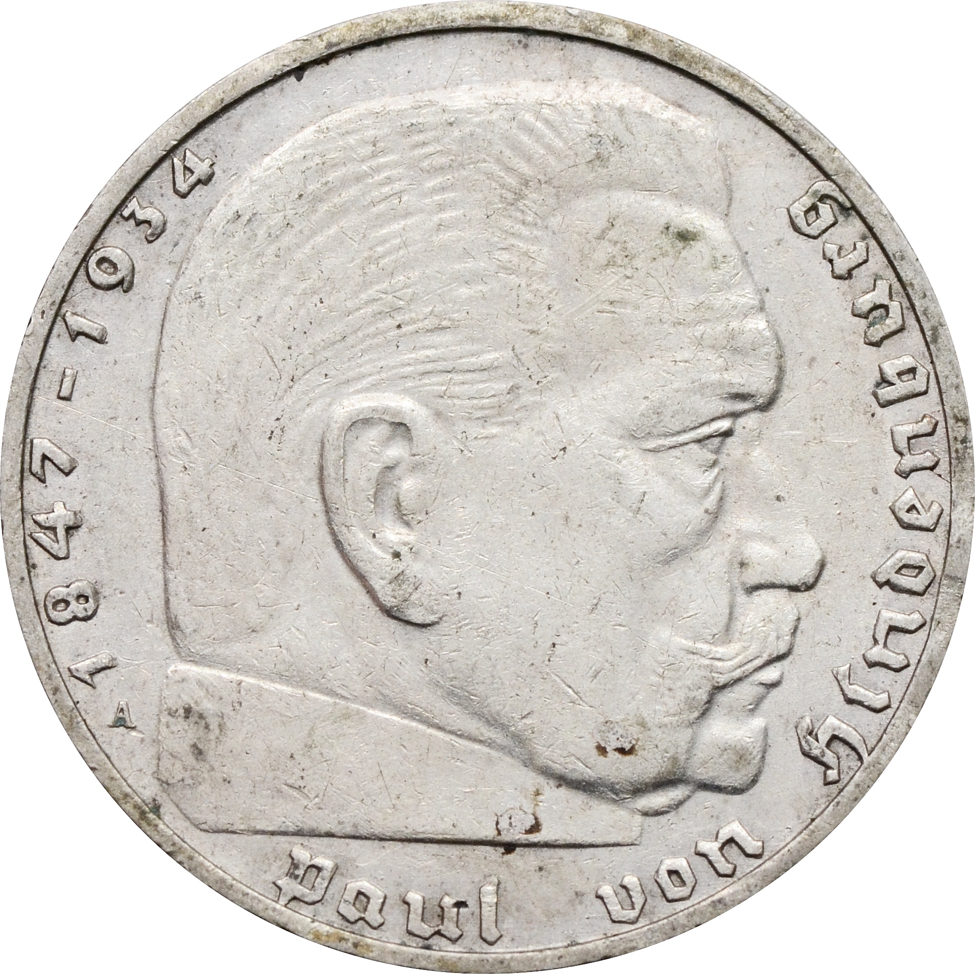 Реверс:по центру монеты расположен портрет Пауля фон Гинденбурга вправо. Вдоль канта надписи: "Paul von Hindenburg 1847-1934". Левее от портрета указана буква монетного двора: "A".