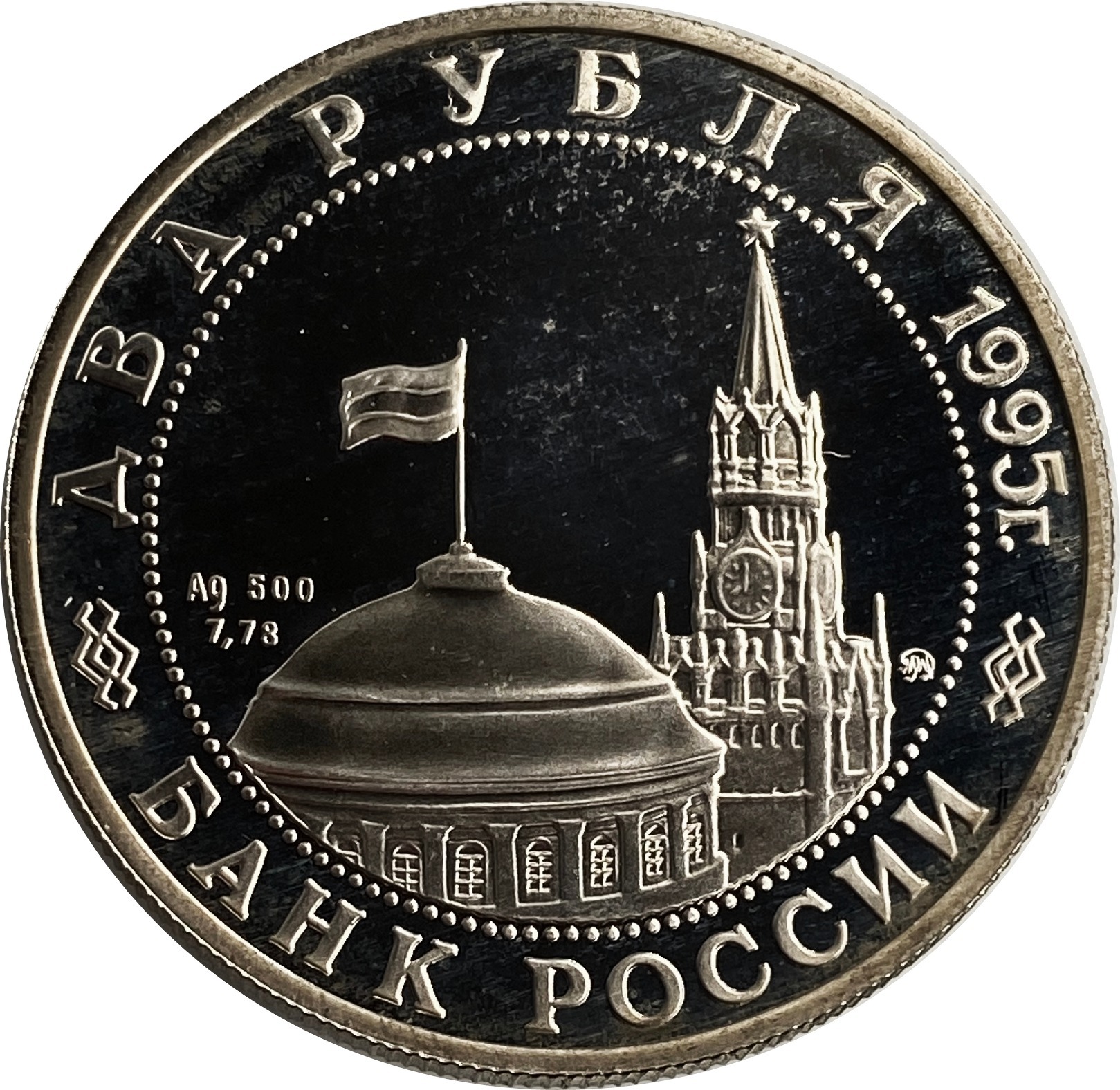Аверс: в центре монеты герб Банка России. Над ним, вдоль канта, номинал полукругом: "ДВА РУБЛЯ" и указан год чеканки: "1995г.". В середине в ободке из точек изображение Спасской башни Московского Кремля и частично перекрывающего ее купола Сенатского дворца с развевающимся флагом, с внутренней стороны точечного ободка справа монограмма монетного двора: "ММД", рядом вес монеты: "7,78". Снизу надпись: "БАНК РОССИИ".