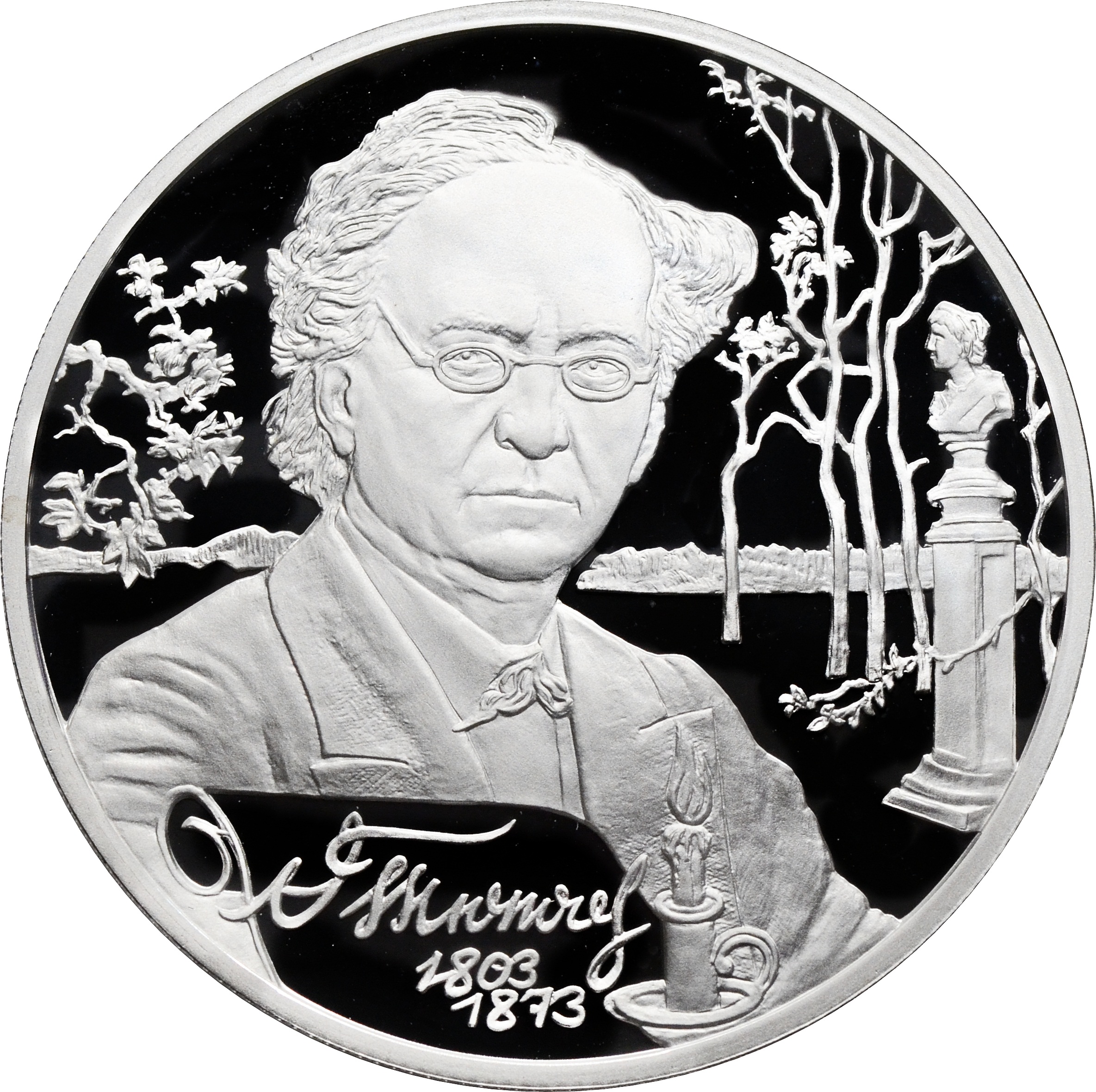 Реверс: по центру монеты расположен рельефный портрет Тютчева. Ниже подпись: "Ф. Тютчев" и даты в две строки "1803 - 1873".