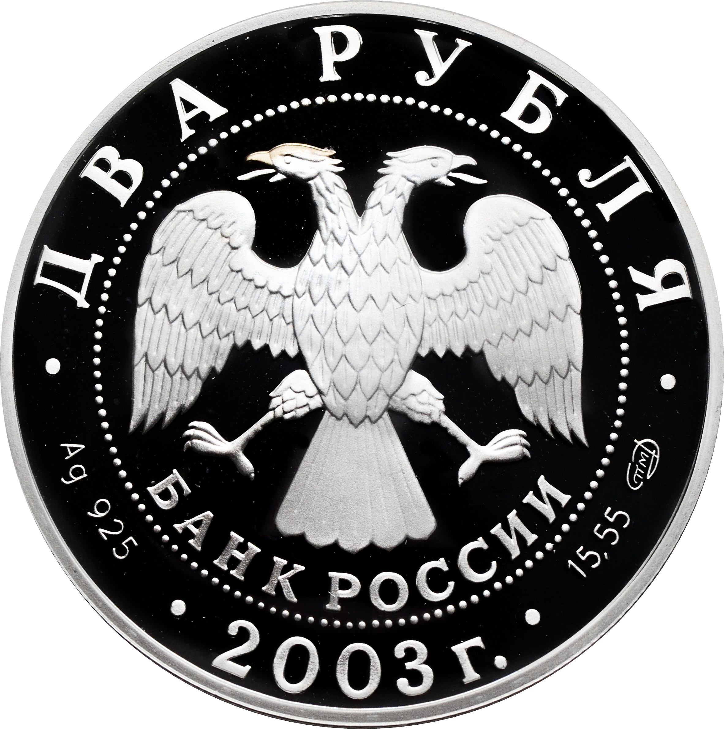 Аверс: в центре монеты герб Банка России. Над ним, вдоль канта, номинал полукругом: "ДВА РУБЛЯ" и указан год чеканки: "2003 г.". Снизу размещен товарный знак монетного двора и вес монеты: "15,55". Слева указан метал монеты: "Ag 925". Снизу, под гербом надпись: "БАНК РОССИИ".