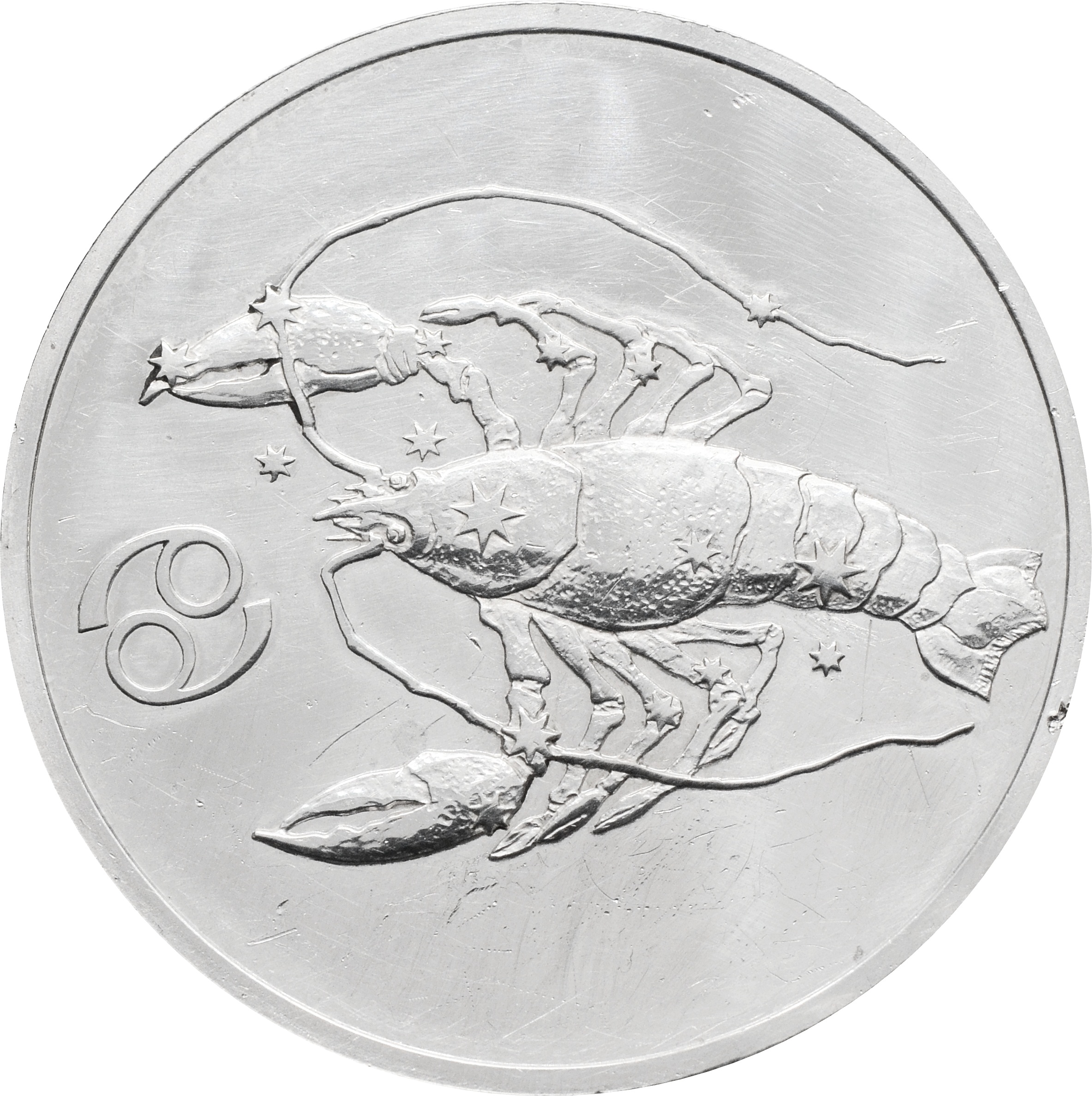 Реверс: по центру монеты расположено рельефное изображение рака.