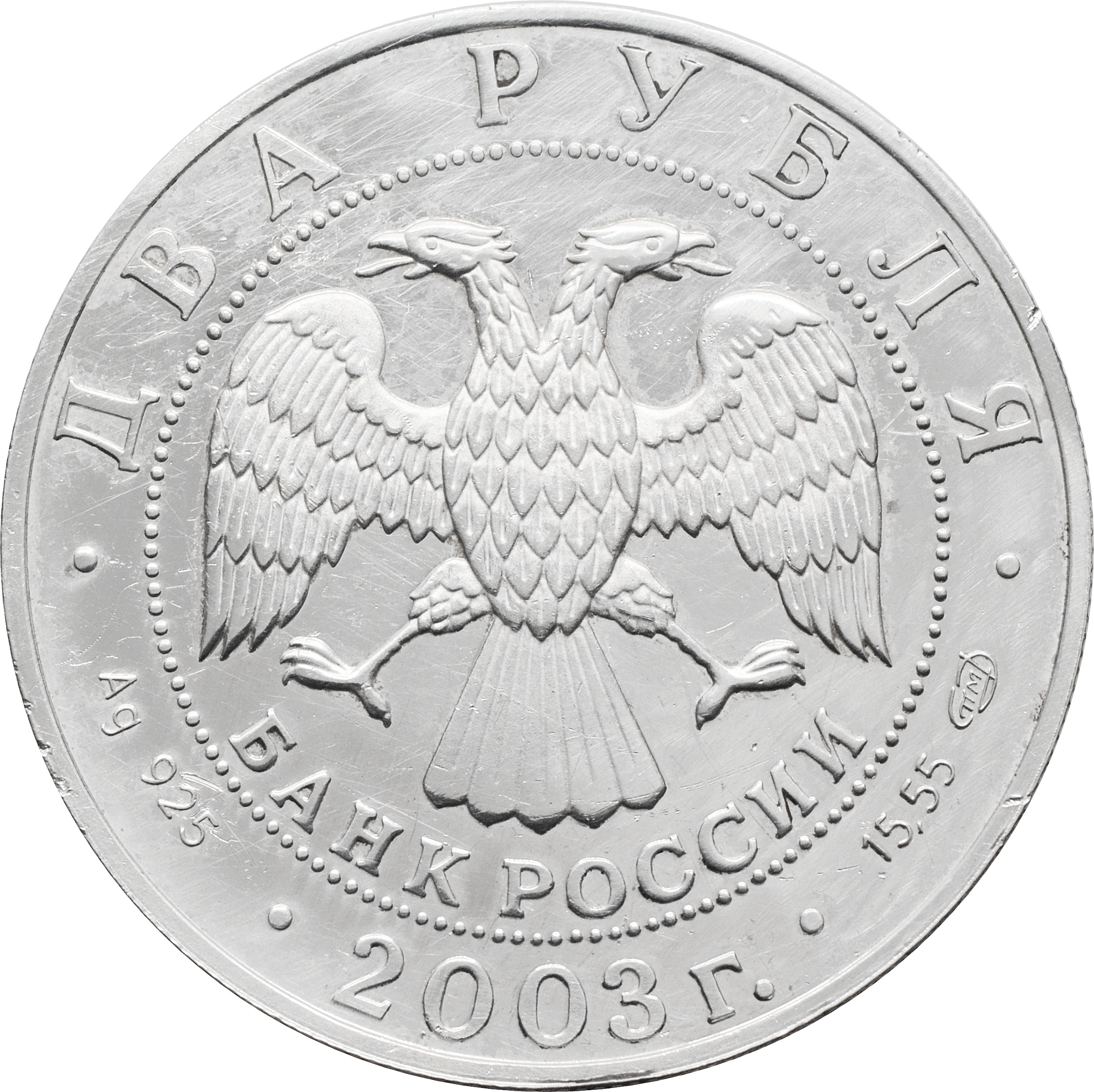 Аверс: в центре монеты герб Банка России. Над ним, вдоль канта, номинал полукругом: "ДВА РУБЛЯ". Справа размещен товарный знак монетного двора и вес монеты: "15,55". Слева указан метал монеты: "Ag 925". Снизу, под гербом надпись: "БАНК РОССИИ", ниже указан год чеканки: "2003 г.".