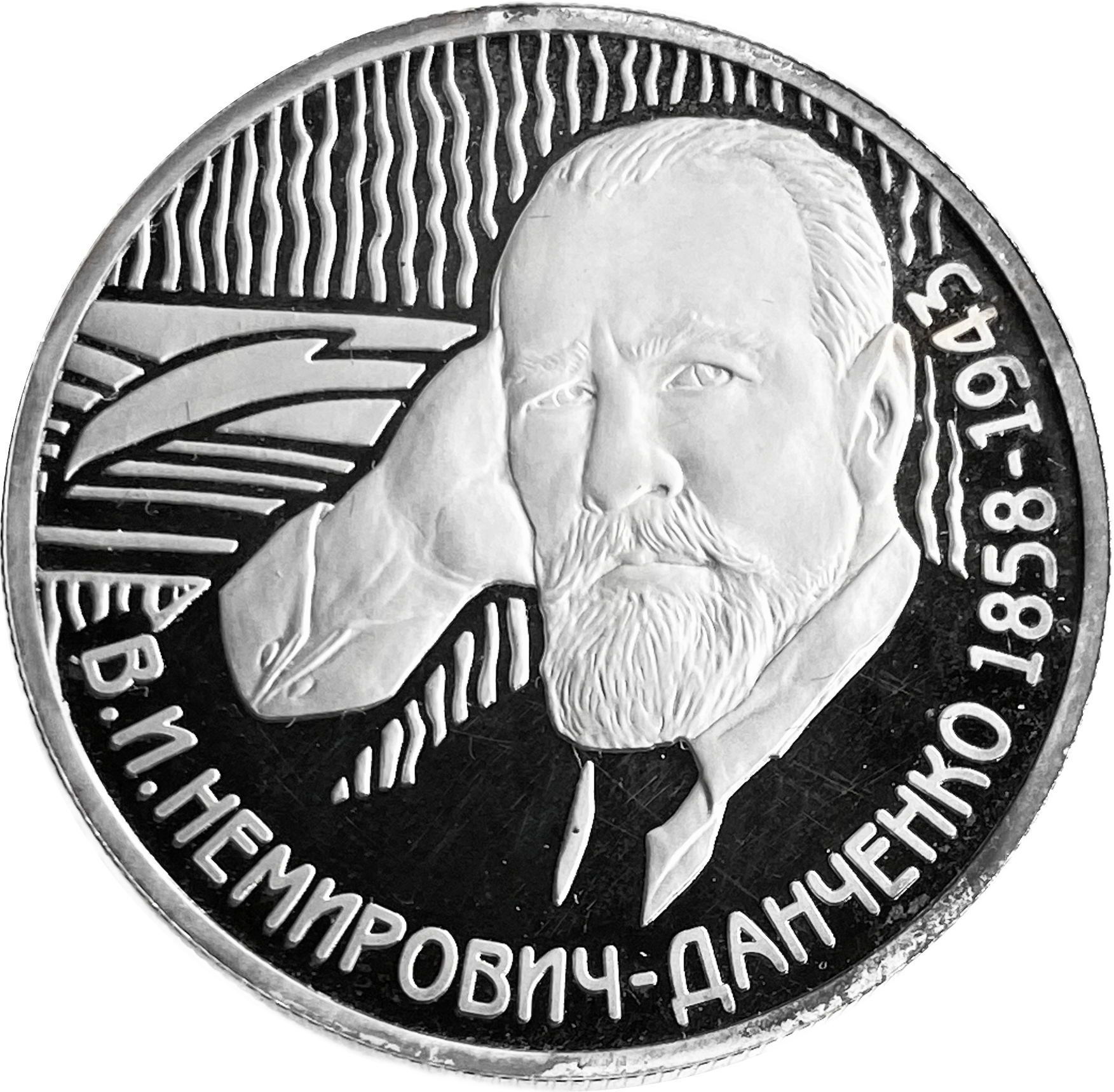 Реверс: по центру монеты расположено рельефное изображение портрета Владимира Немировича-Данченко. Ниже подпись: "В.И.НЕМИРОВИЧ-ДАНЧЕНКО" и даты в две строки "1858 - 1943".