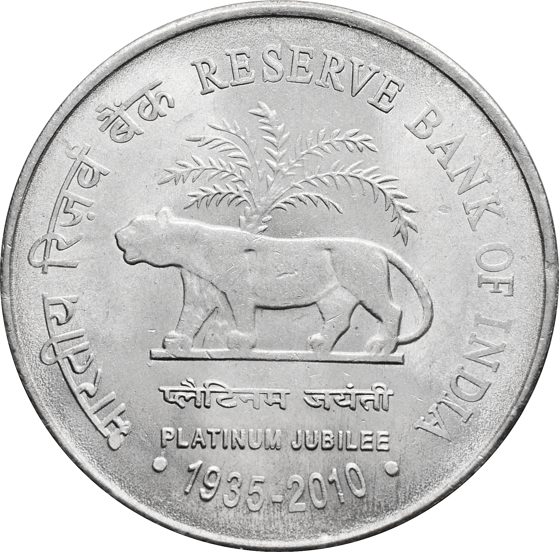 Аверс: в центре расположен логотип резервного банка Индии. Снизу годы существования: "1935 - 2010".