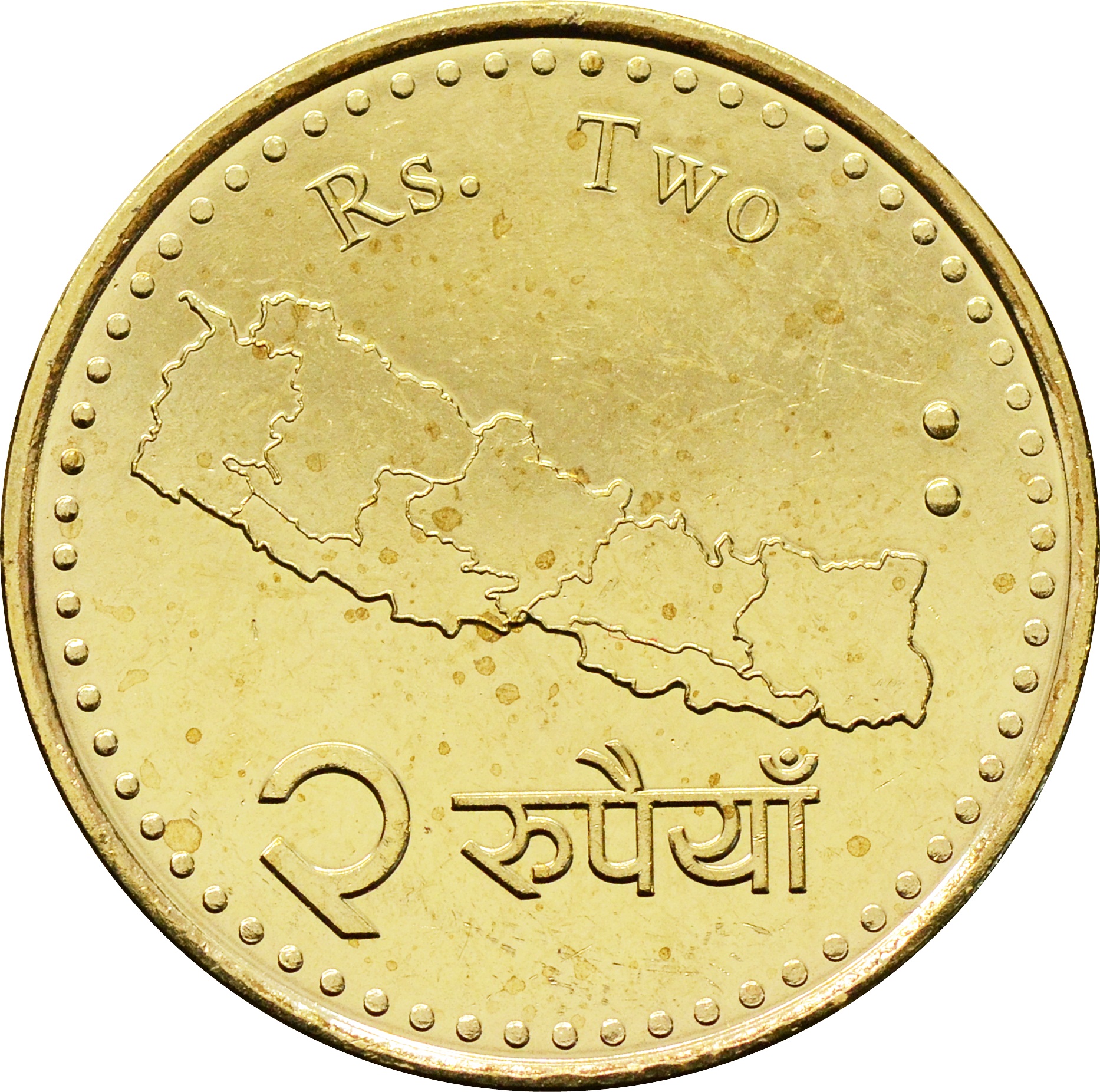 Реверс: по центру декоративный рисунок с изображением карты Непала. Чуть ниже надпись: "२ रुपैयाँ", а сверху подпись: "Rs. Two".