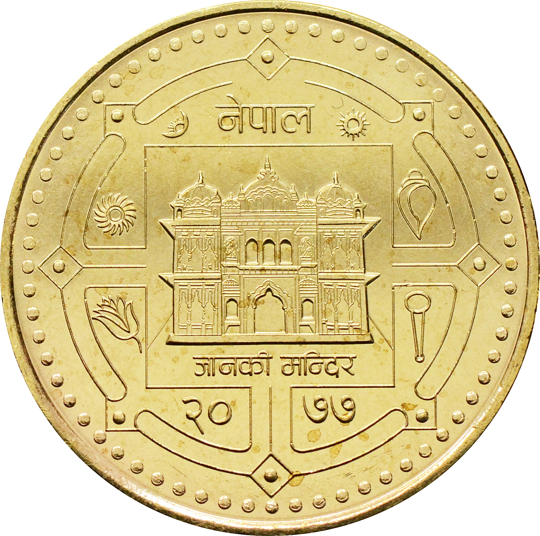 Аверс: по центру декоративный рисунок с изображением дворца. Чуть ниже надпись: "नेपाल जानकी मन्दिर". Снизу указан год чеканки: "२०७७".