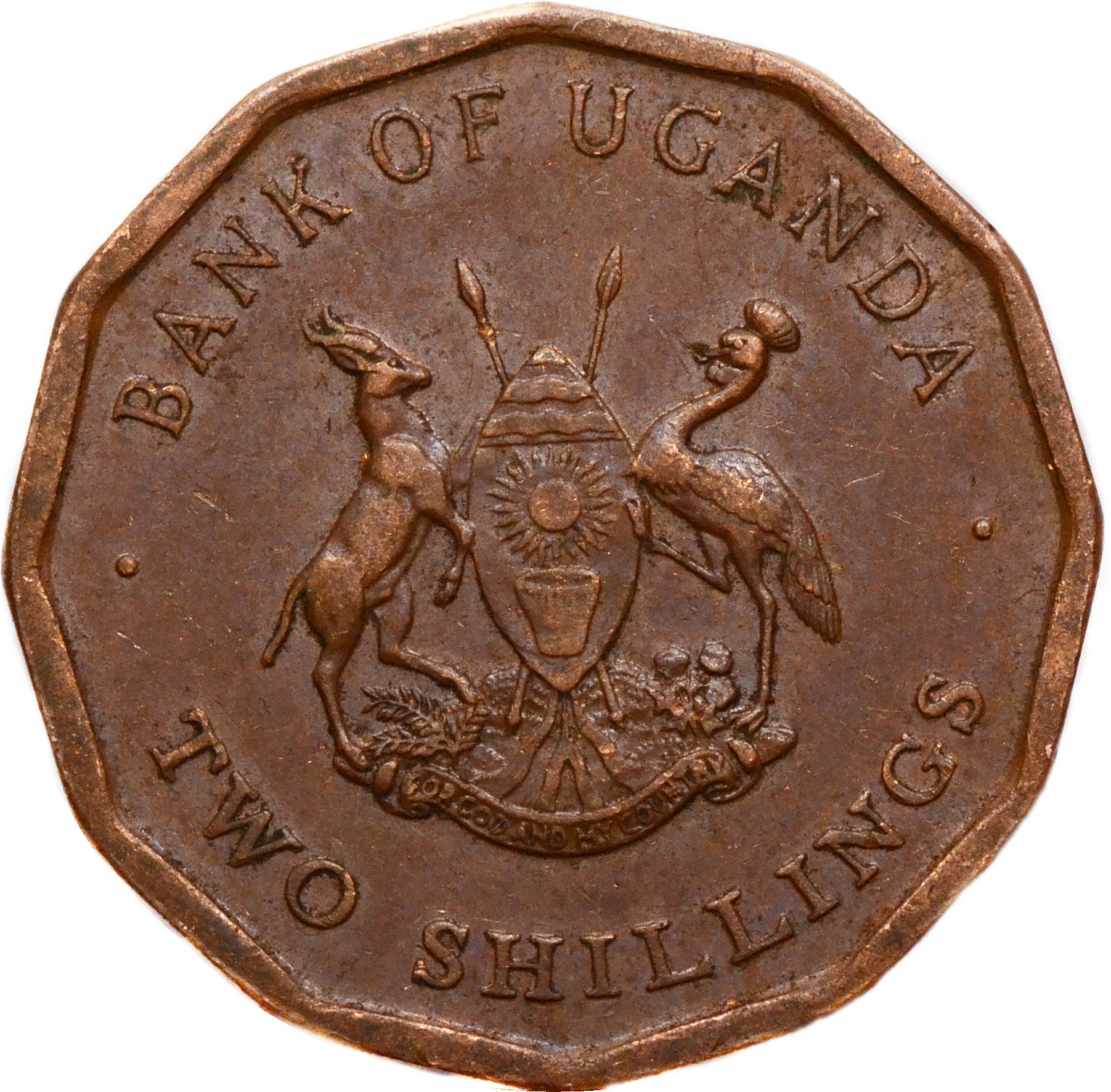 Аверс: по центру расположен герб Уганды, сверху надпись: "BANK OF UGANDA", а снизу номинал прописью: "TWO SHILLINGS".