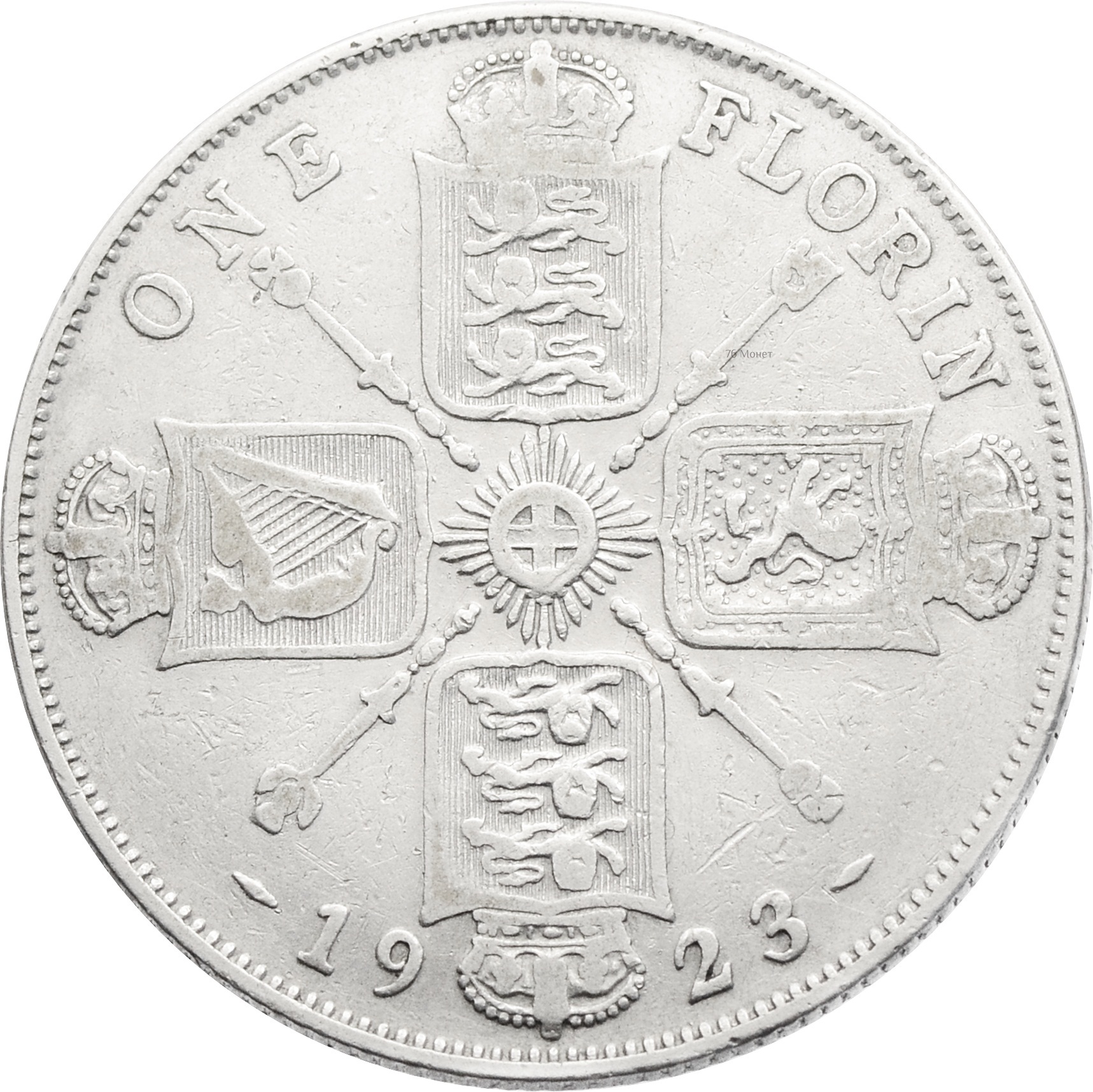 Реверс: по центру королевские гербы образующие крест. Вдоль канта указан номинал: "ONE FLORIN" с годом чеканки: "1923".