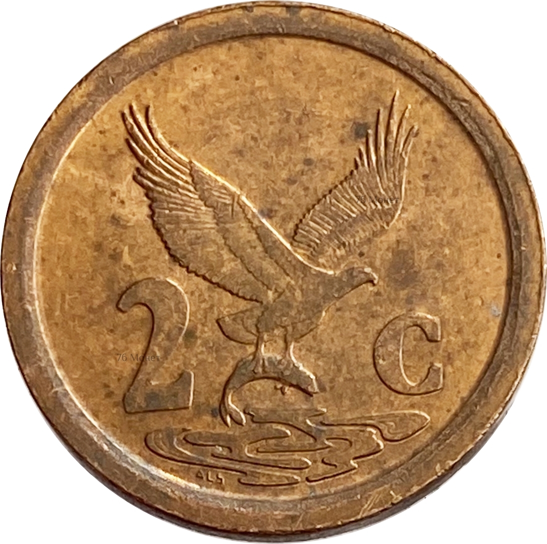 Монета 2 цента 1990-1995 (случайный год) ЮАР в состоянии XF (очень хорошее).