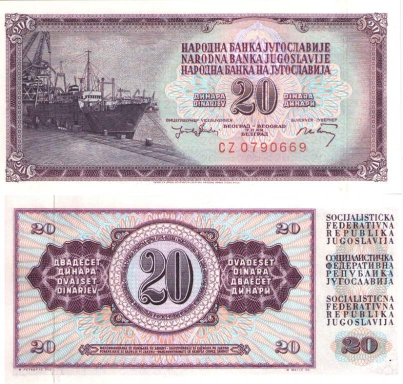Лицевая сторона: правее центра изображен корабль в порту. По центру надпись на трех языках: "Народный банк Югославии". Ниже номинал: "ДИНАРА DINARJEV 20 DINARA ДИНАРИ". Еще ниже подписи ответственных лиц и серийный номер банкноты.