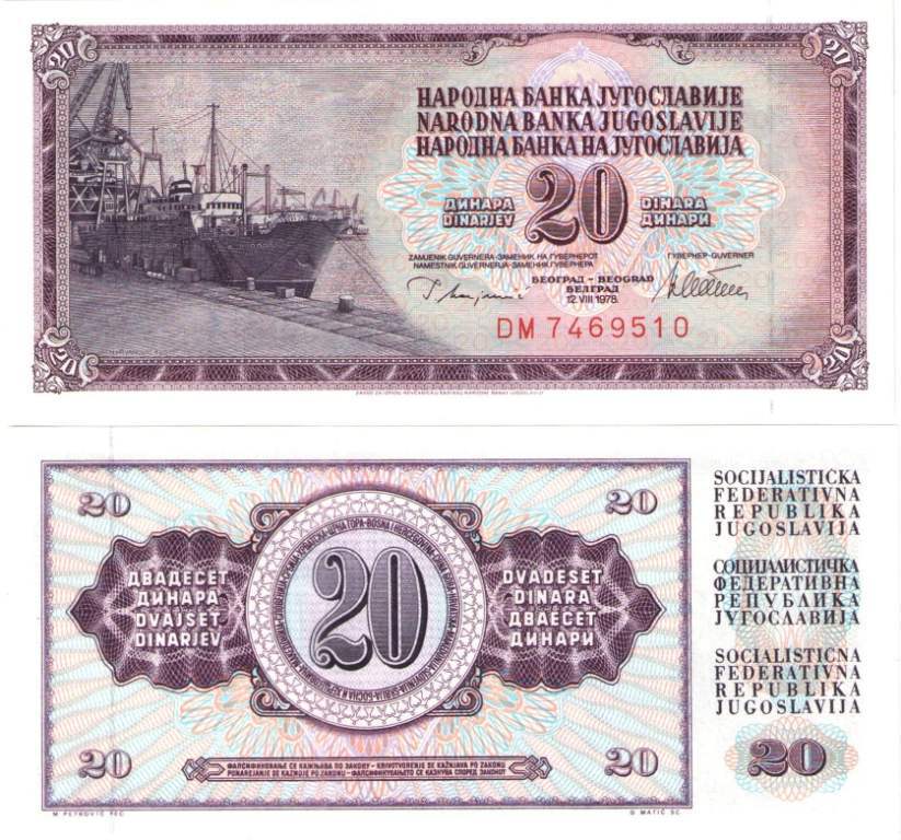 Лицевая сторона: правее центра изображен корабль в порту. По центру надпись на трех языках: "Народный банк Югославии". Ниже номинал: "ДИНАРА DINARJEV 20 DINARA ДИНАРИ". Еще ниже подписи ответственных лиц и серийный номер банкноты.