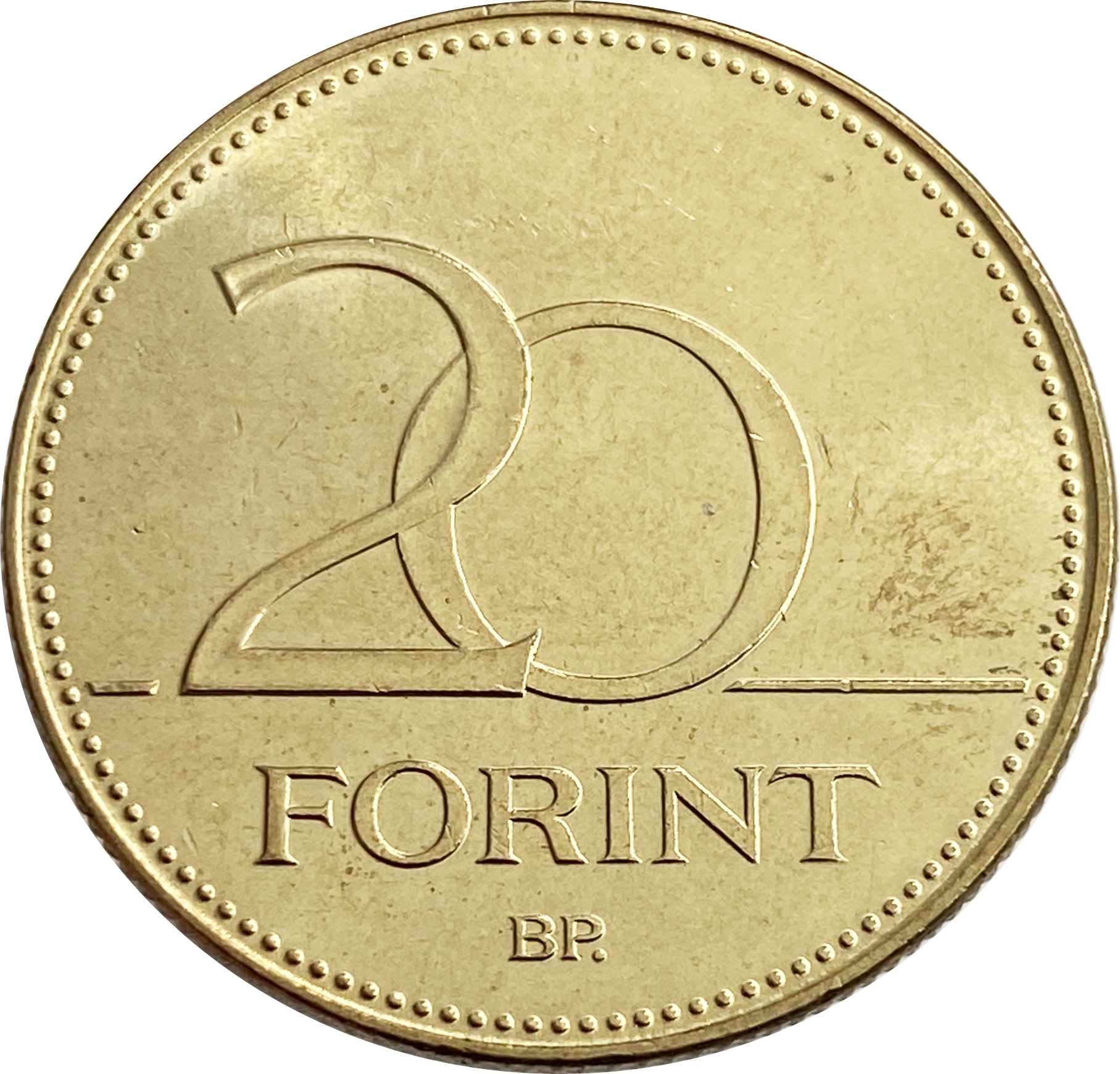 Реверс: чуть левее центра указание номинала в две строки: "20 FORINT". Вдоль края монеты жемчужные горошины.