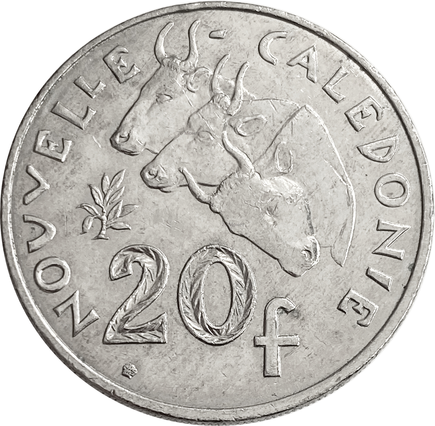 Реверс: по центру расположено изображение трех быков. Полукругом, вдоль канта надпись: "NOVVELLE CALEDONIE". Внизу размещен номинал монеты: "20 f".