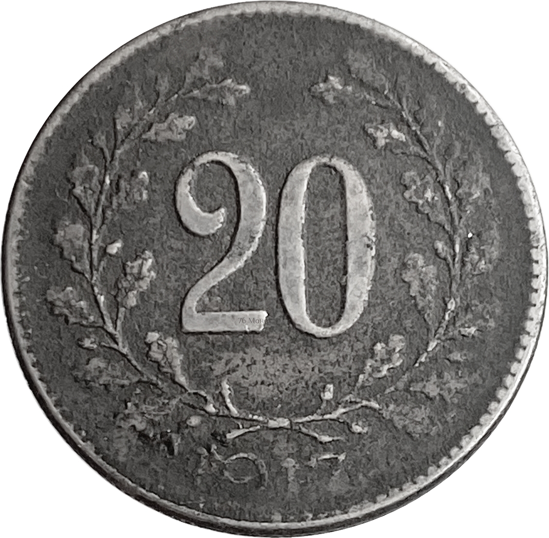 Реверс: в центре монеты указан номинал - крупная цифра "20", ниже год чеканки: "1917". Номинал заключен в венок.